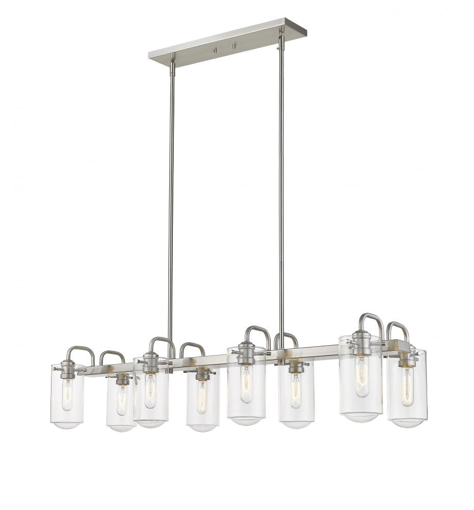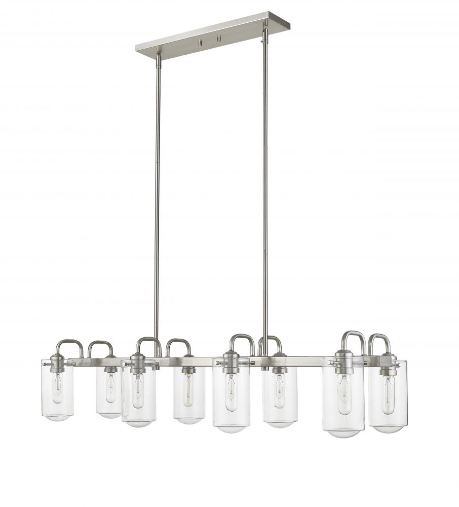 Infuse light and industrial energy into any transitional space. Brushed nickel finish steel forms a gleaming plate, downrods, and frame that make this eight-light island chandelier a perfect choice.