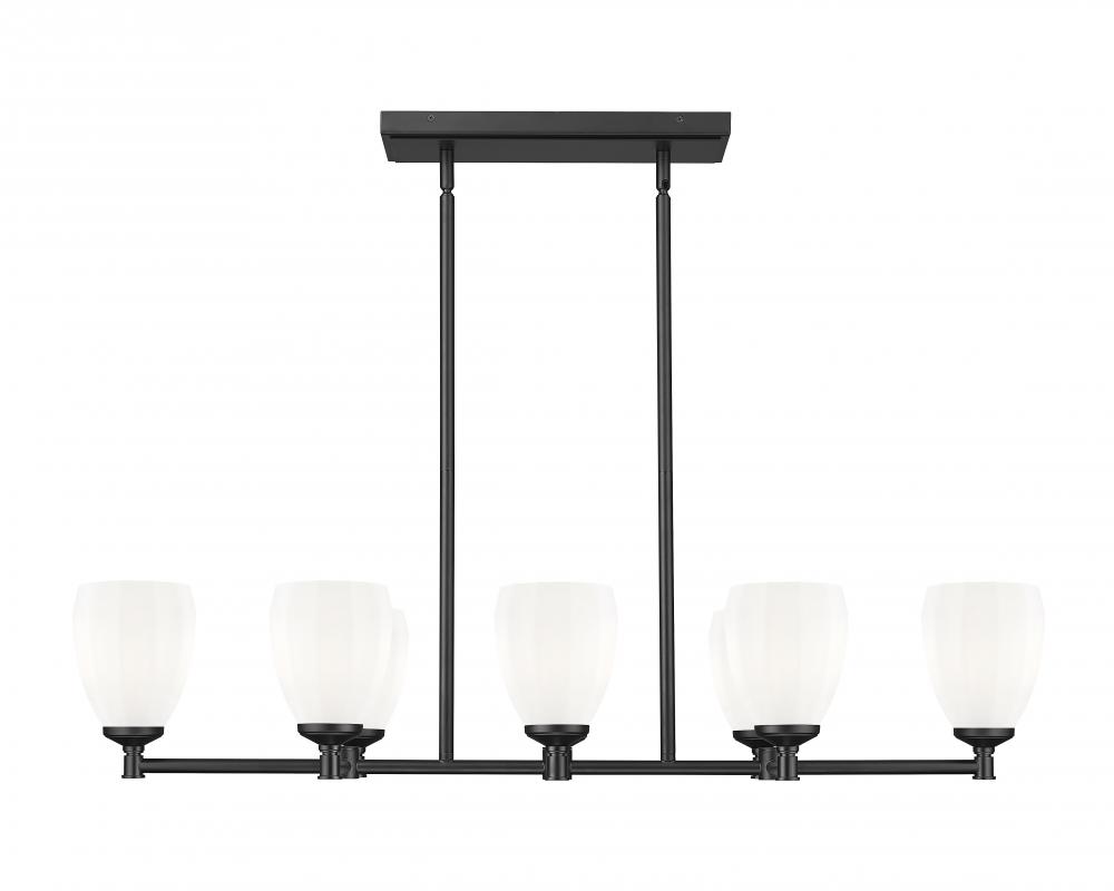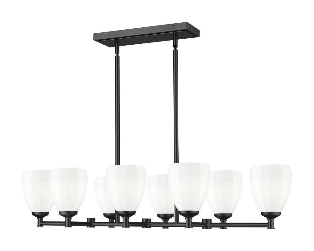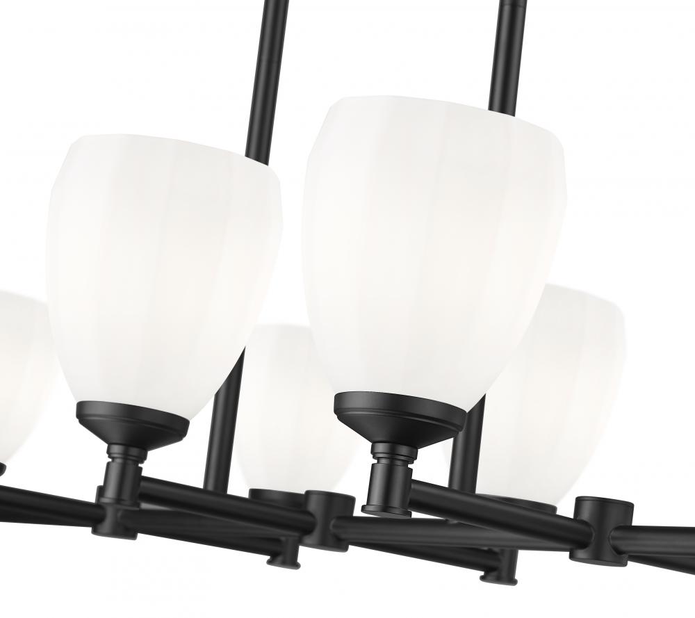Capture a classical ambiance while maintaining updated aesthetics with this modern eight-light linear chandelier. In matte black, its the perfect addition to a bold kitchen island, offering bright illumination with matte opal glass shades with a unique faceted design. A strong frame features clean lines and rich angles that offer durability with steel construction.
