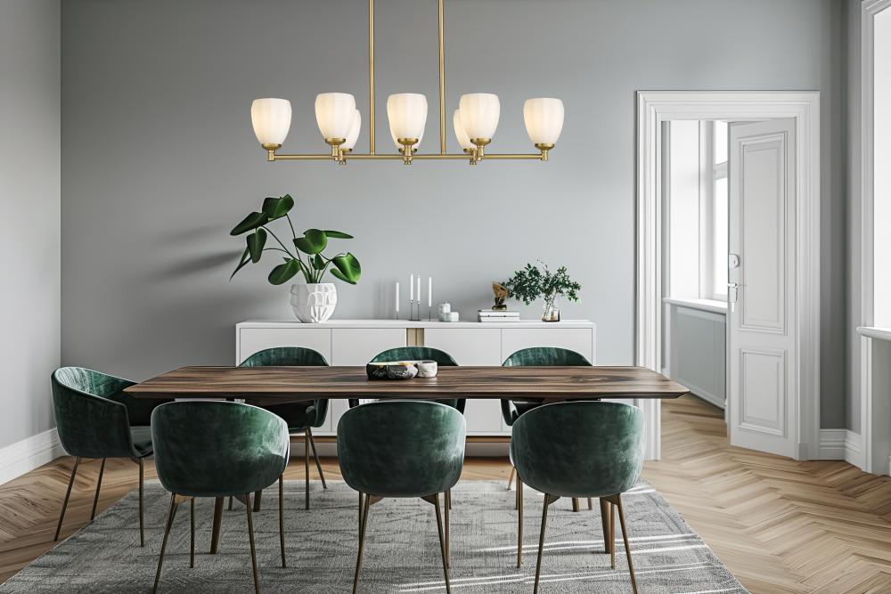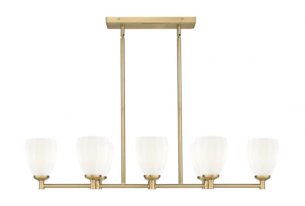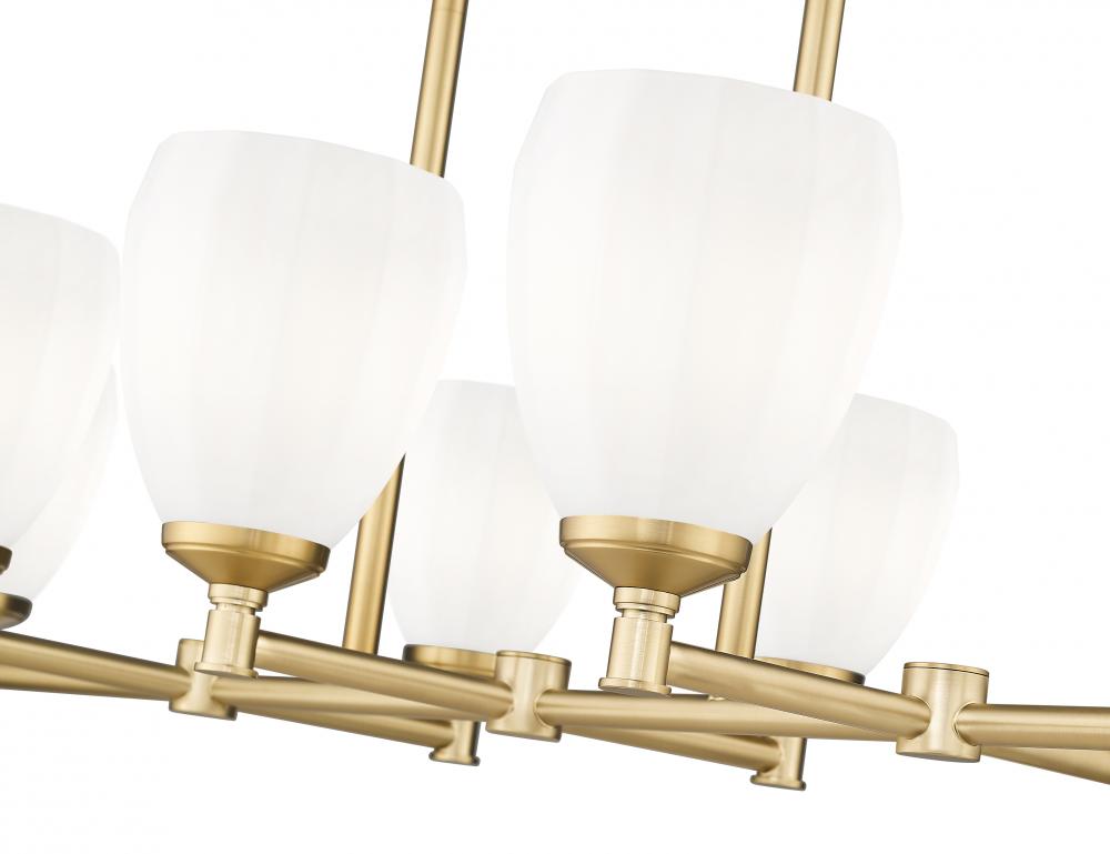Amplify restoration ambiance with the timeless nature of this modern eight-light linear chandelier. In rich modern gold finishing over a steel frame, it captures a sense of vintage character while offering a chic complement to contemporary living. Its linear silhouette is ideal for a kitchen island or dining table and matte opal glass shades ensure beautiful, inviting illumination.