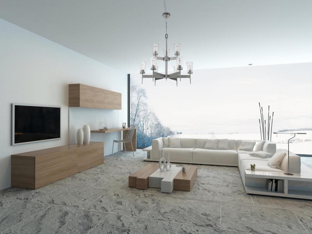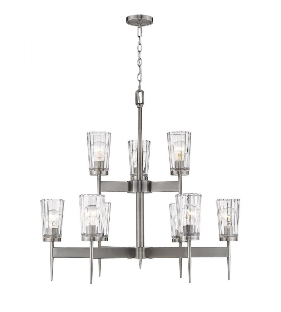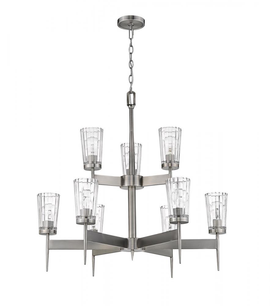 An intriguing two-layer silhouette with impressive materials allow this nine-light chandelier to become part of an overall sophisticated design scheme. Gorgeous flared glass shades and sleek polished Antique Nickel finish extension stems in a geometric arrangement offer an upscale attitude and an efficient way to illuminate prominent living areas with class.