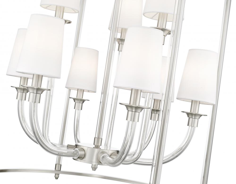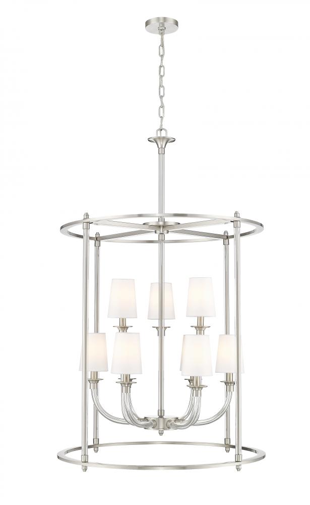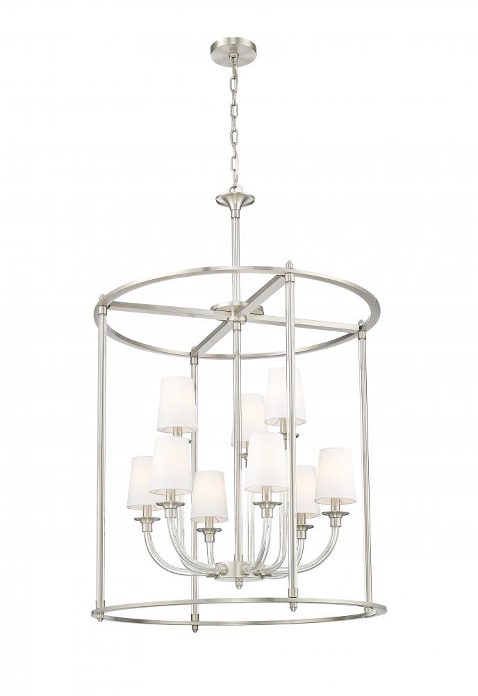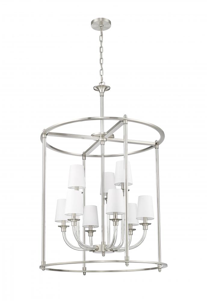 Marrying classical pre-war sophistication with updated finishes, this modern nine-light chandelier is a two-tiered design with an open cage framework. In brushed nickel, it gleams softly in the light and casts beautiful illumination with tapering white fabric shades.
