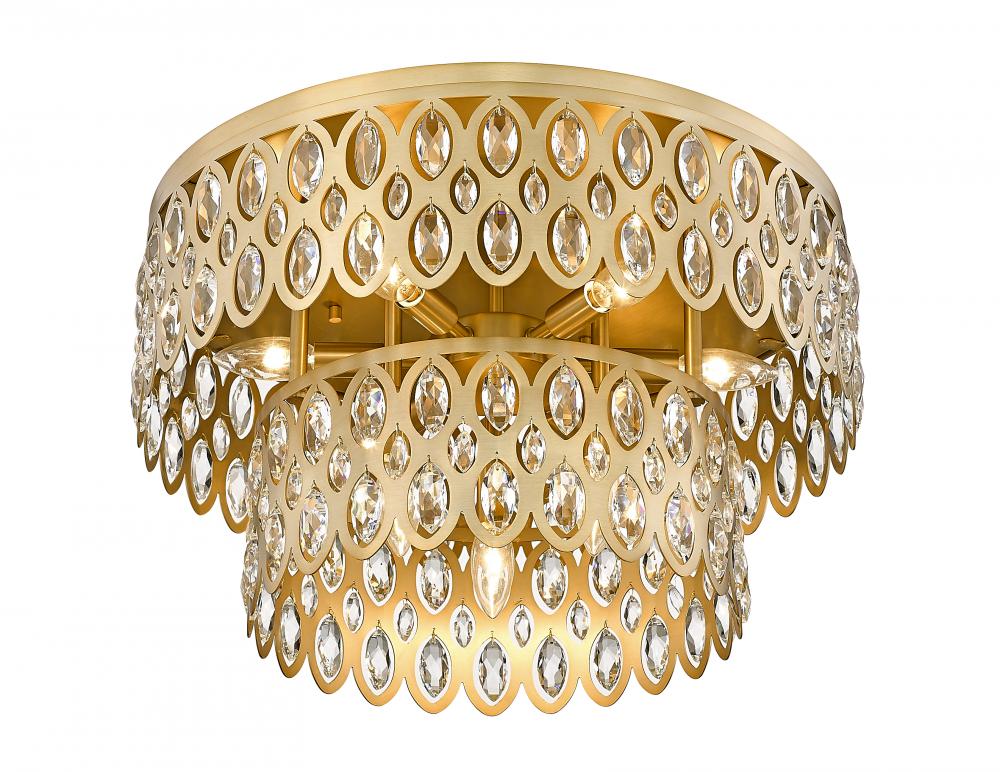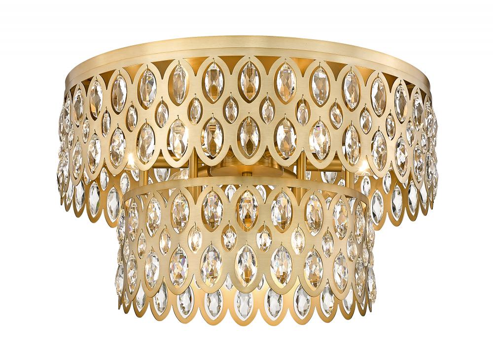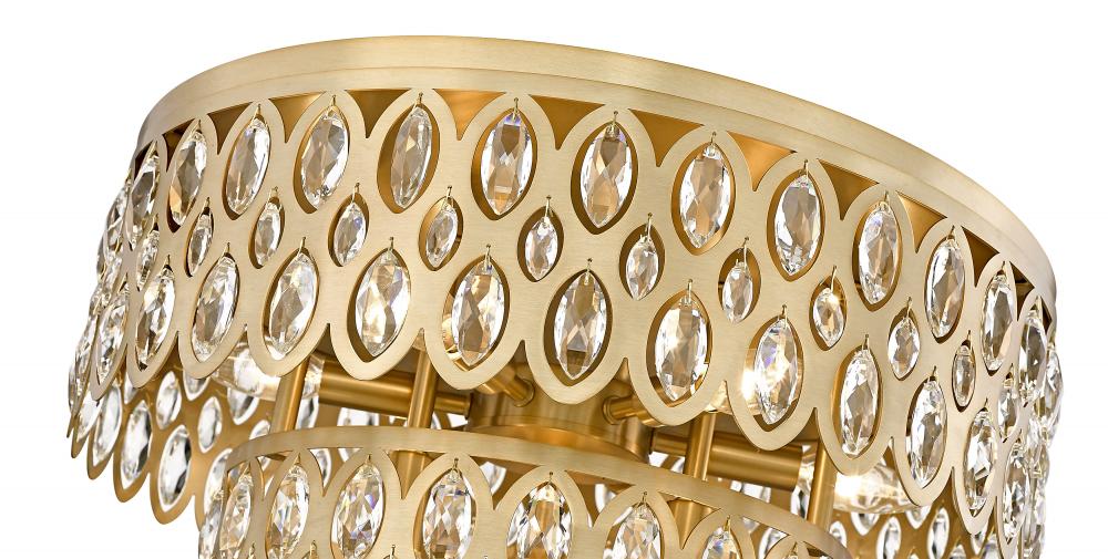 Wide double tiers showcase the sparkling crystal baubles that define this Dealey collection nine-light flush mount ceiling light. An heirloom brass finish is both warm and welcoming, delivering richness and elegance in a piece that mimics a classic chandelier while demanding much less ceiling clearance. Glittering crystal ensures a look thats both glam and elegant, offering eye-catching ambiance in your elevated living space.