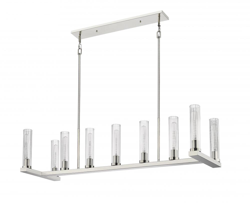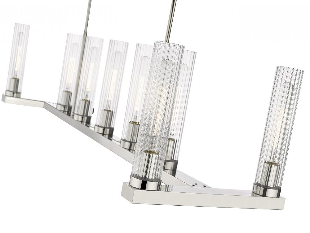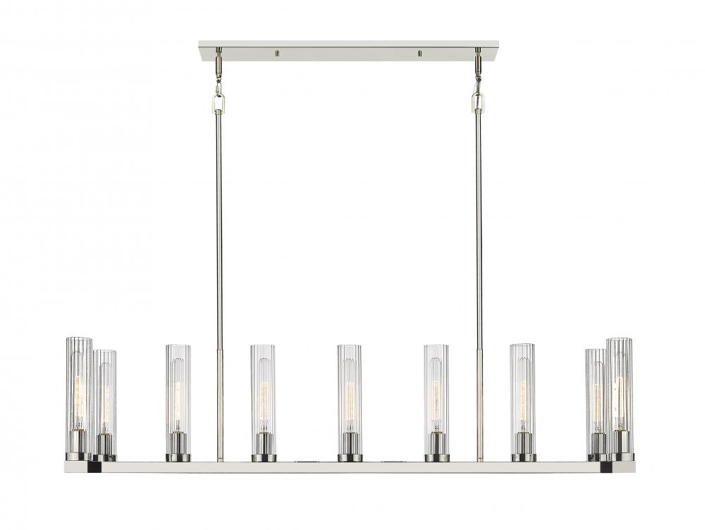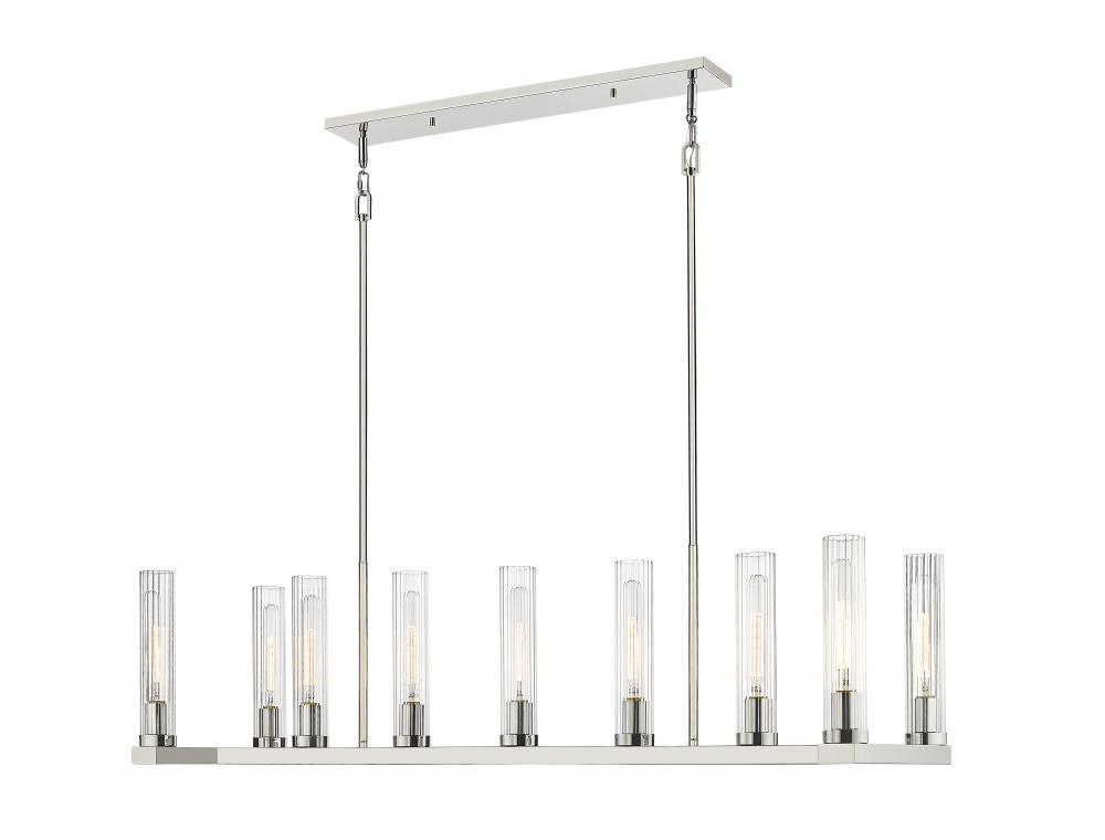 Brilliant radiance and a sleek linear silhouette team up to offer stunning beauty in the Beau nine-light island/billiard light. Bring the lore of industrial-inspired no-nonsense charm with a shimmering facet of polished nickel finish steel and sparkling clear fluted glass shades, all arranged in a linear fashion. This light frames a kitchen island, billiards table, or any element in a custom living area.