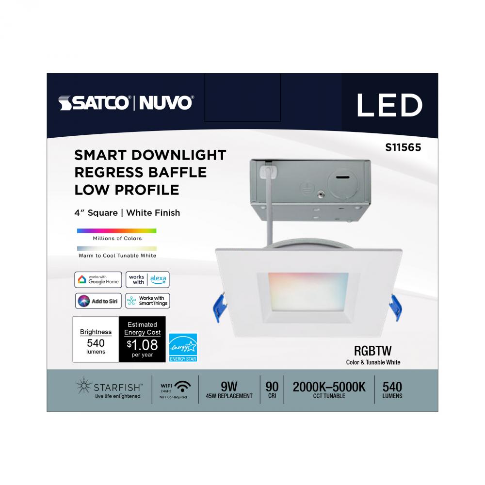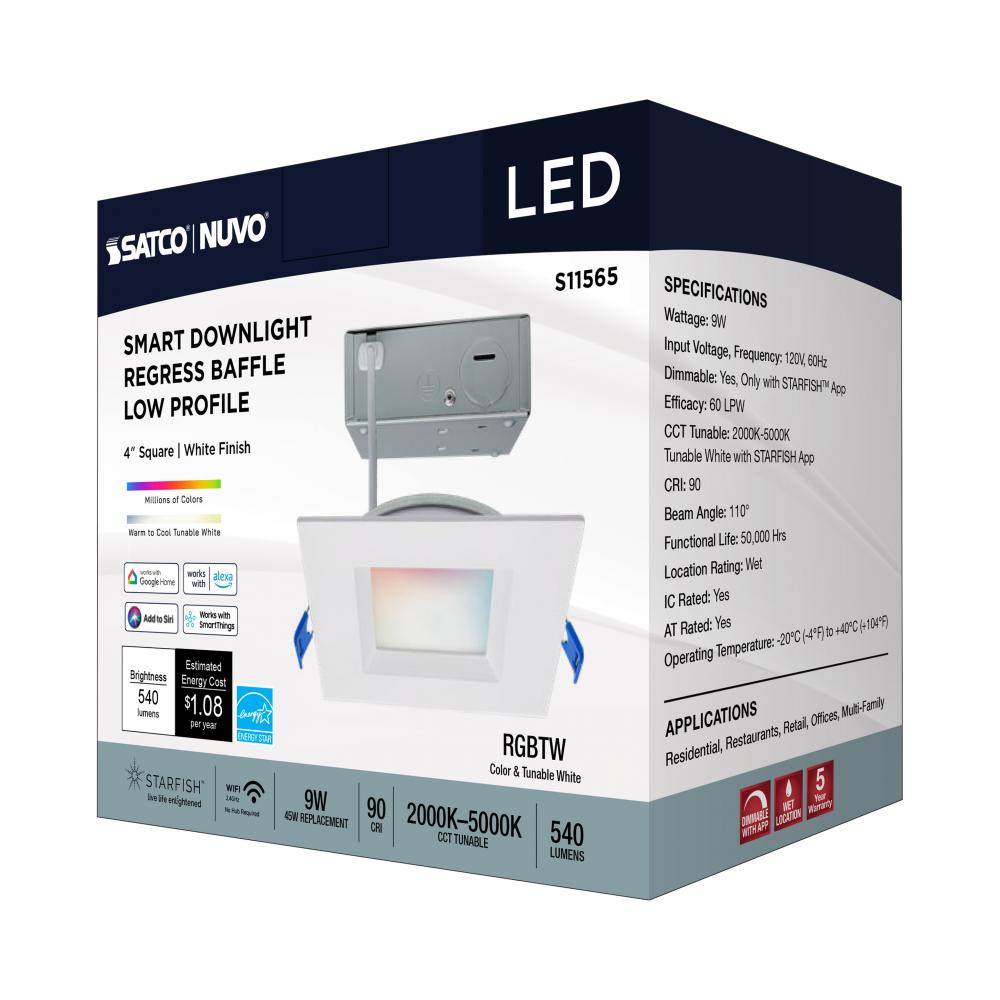 9 Watt; LED Direct Wire; Low Profile Regress Baffle Downlight; 4 Inch Square; Starfish IOT; Tunable White and RGB; 120 Volt; 90 CRI; White Finish