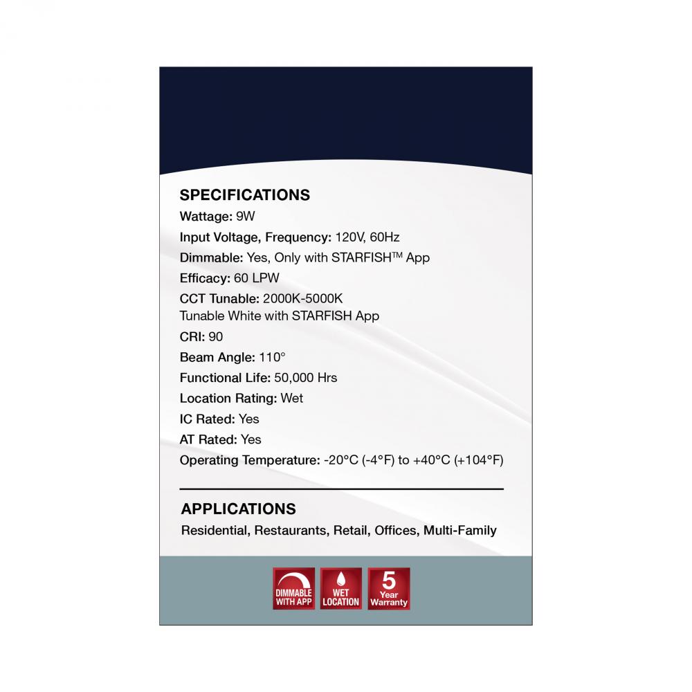 SATCO NUVO's LED Slimfit Downlights with STARFISH technology are the ultimate choice for smart lighting and ambiance control. Download the STARFISH app to customize any tunable white color temperatures from 2000K warm white to 5000K natural light or ch