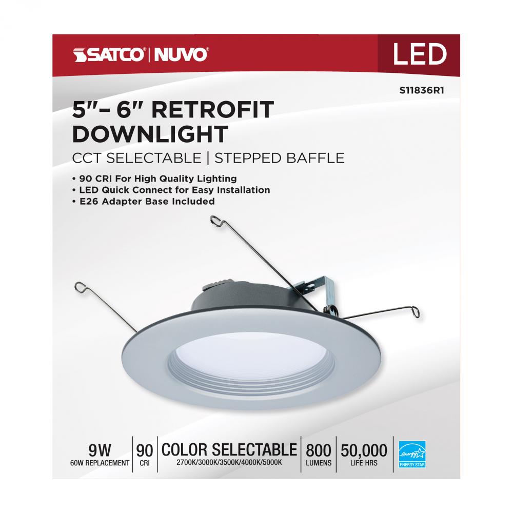 SATCO NUVO's LED Retrofit Downlights are the easy way to convert traditional recessed lighting to LED. Offered in 4-inch and 5/6-inch models, these fixtures are sized for, and come ready with, an E26 base adapter for instant illumination when installed