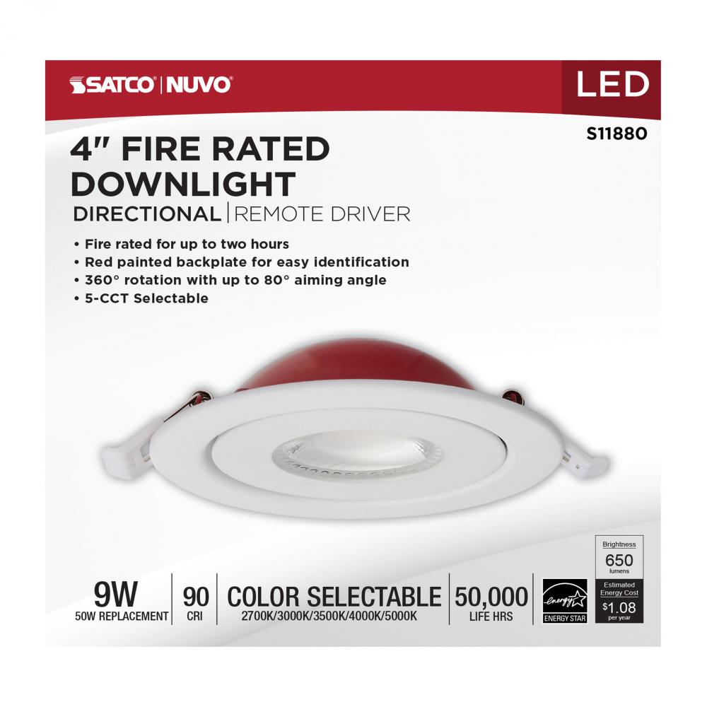 SATCO NUVO's S11880 4-inch Round Fire Rated Directional Downlight is the perfect solution to increase safety and offer focused light. Designed to provide exceptional illumination, this downlight also provides two hours of protection in the event of a f