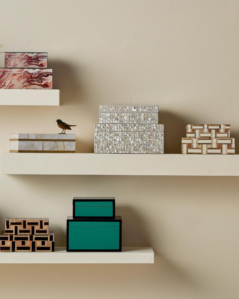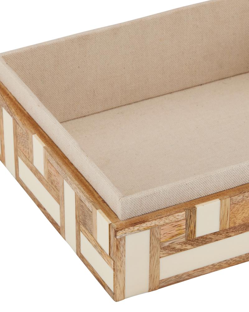 The Aarna Cream Box Set with its basket-weave pattern is made of pieces of wood interspersed with strips of ivory composite. The contrast of the textural woodgrains and the sleek composite creates such an interesting aspect to this design, as does the angular lines of the overall rectangular shapes that echo the elongated pieces on their surfaces. The interiors of the boxes are lined in white linen.
