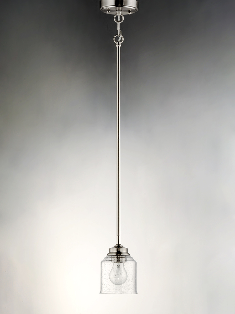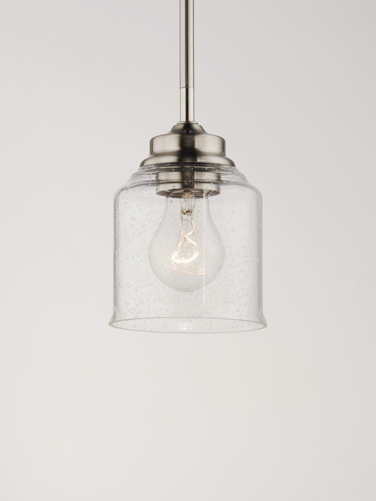 A modest frame of steel tubing gently bends to support a cluster of Clear Seedy bell-shaped glass. Similarly the bobeches and other metal accents echo that traditional bell shape creating an instant classic. An easy choice with transitional appeal, choose