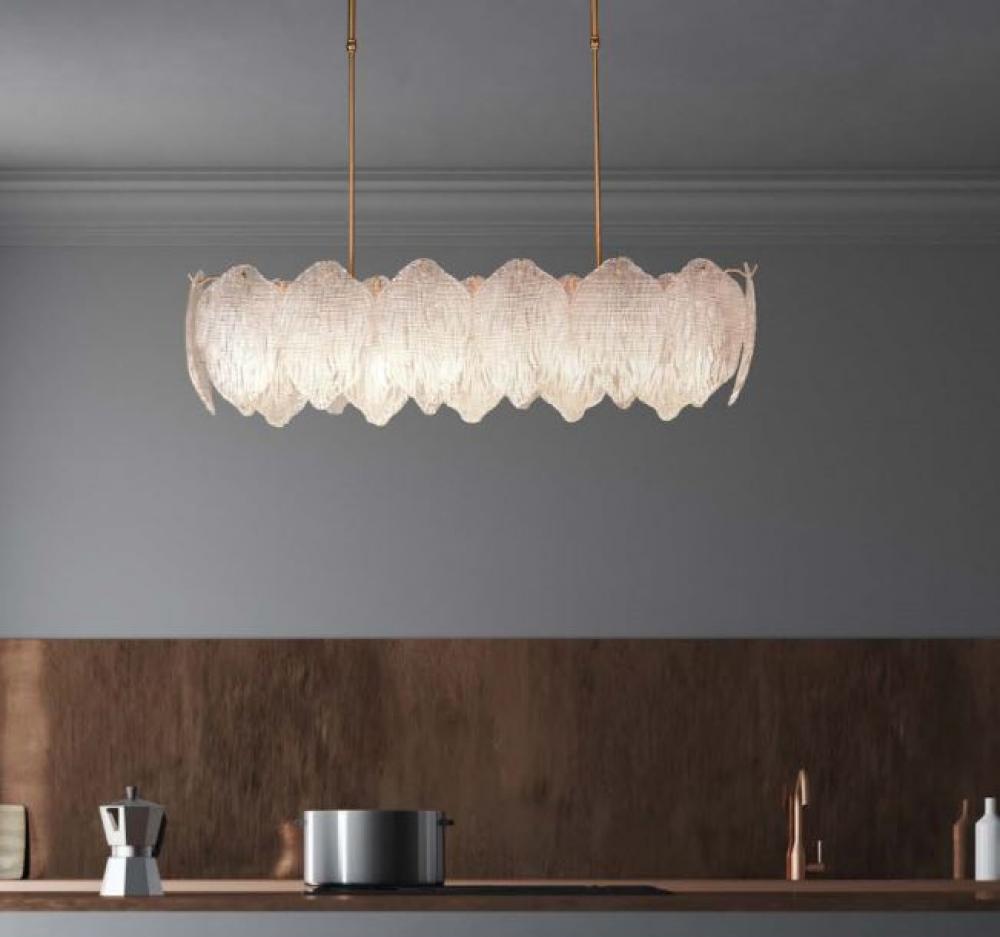 This Unique Oval chandelier adds glamorous, vintage-inspired detail to your kitchen or dining area. Sturdily crafted with a steel frame and finished in distressed gold, this organic oval Island pendant gives us a layered look where each etched glass leaf is placed one by one on the frame until the chandelier is in full bloom. An etched organic design brings elegant texture to a classic glass island light. The distressed Gold finish completes the antique feel of this beautiful fixture. Uses telescopic rods for adjustable height.