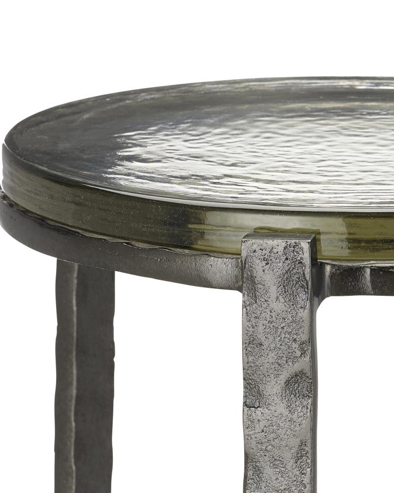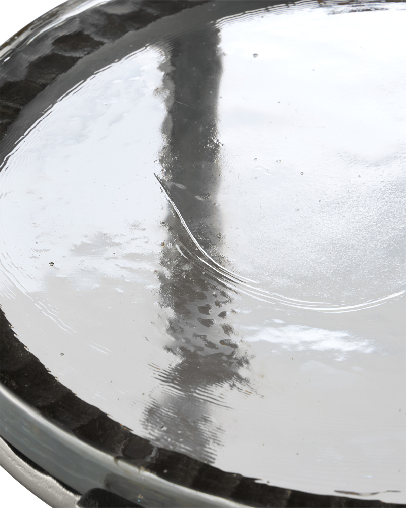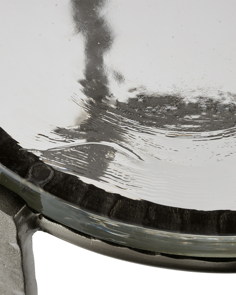 The point at which art and fine craftsmanship meet is where the Acea Graphite Drinks Table resides. Made of cast aluminum poured into a hammered mold to create even greater texture, the silver drinks table is topped with a cast glass disc that is equally textural and luminous. This table will be a piece of jewelry in a space.
