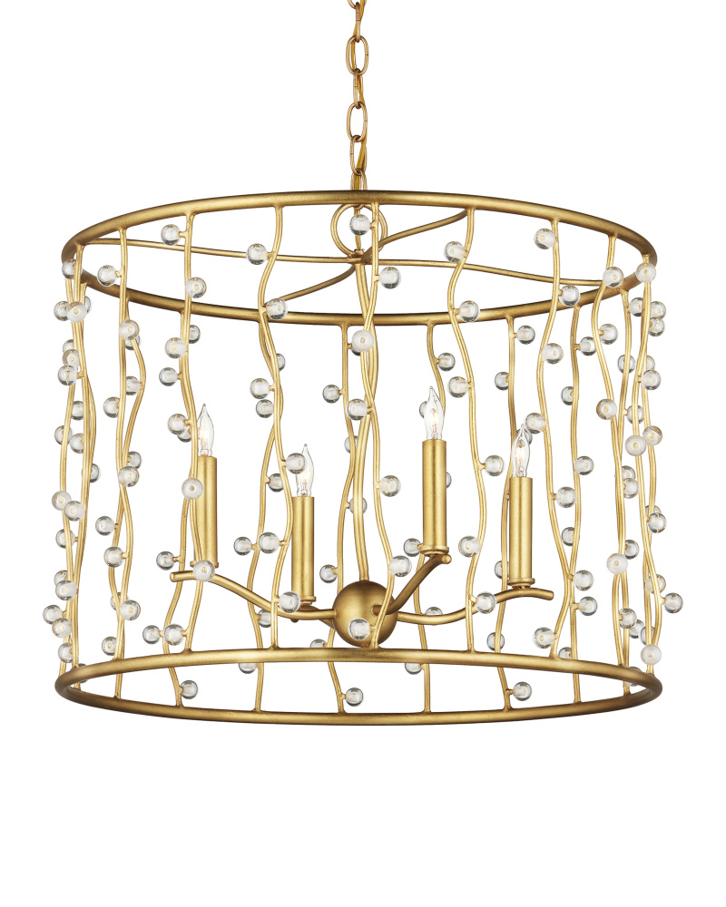 The Adagio Chandelier is a gold chandelier that adroitly holds its crystal beads, which are affixed to wavy metal wires that flow between the top and bottom rings on tiny barbs. The pieces of crystal are prone to glow even when the lights are not switched on, as is the brilliant contemporary gold leaf finish on the metal. Adjustable from 25.25" to 93.25" with use of included chain/rod kit/cable. If your space calls for a longer drop, additional chain/rods/cable is available for purchase.