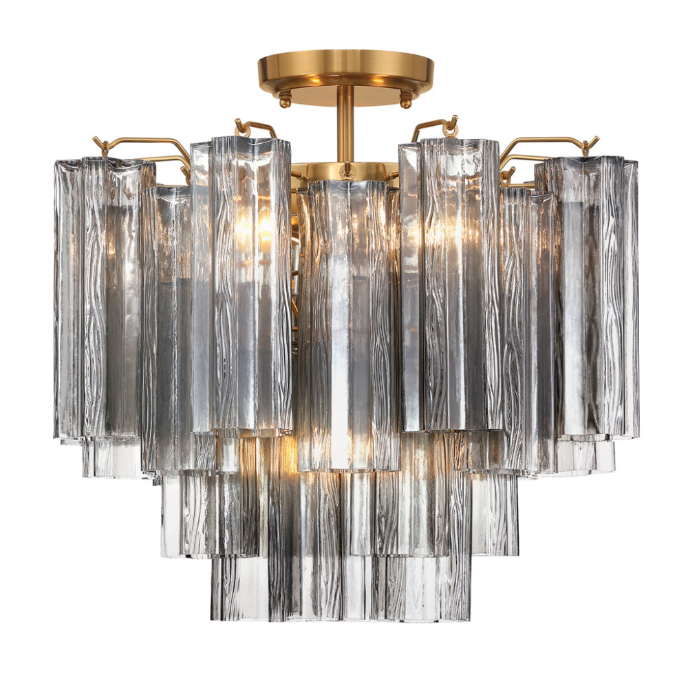 The captivating Addis Lighting Collection is a modern-day interpretation of the iconic mid-century Tronchi chandelier. Inspired by its predecessor's sleek lines and geometric shapes, the Addis features a polished Chrome or Aged Brass metal frame that exudes sophistication and style. Its unique design showcases transparent tiers of textured Tronchi glass tubes, forming a mesmerizing 5-point rounded star shape. Choose from a range of glass colors, including clear, amber, smoke, and white, or the stunning Autumn option, which features a captivating multicolor disposition of amber, clear, and smoke Tronchi glass. The Addis Lighting Collection offers various sizes and finishes, allowing you to find the perfect fit for your space while adding a touch of timeless elegance.
