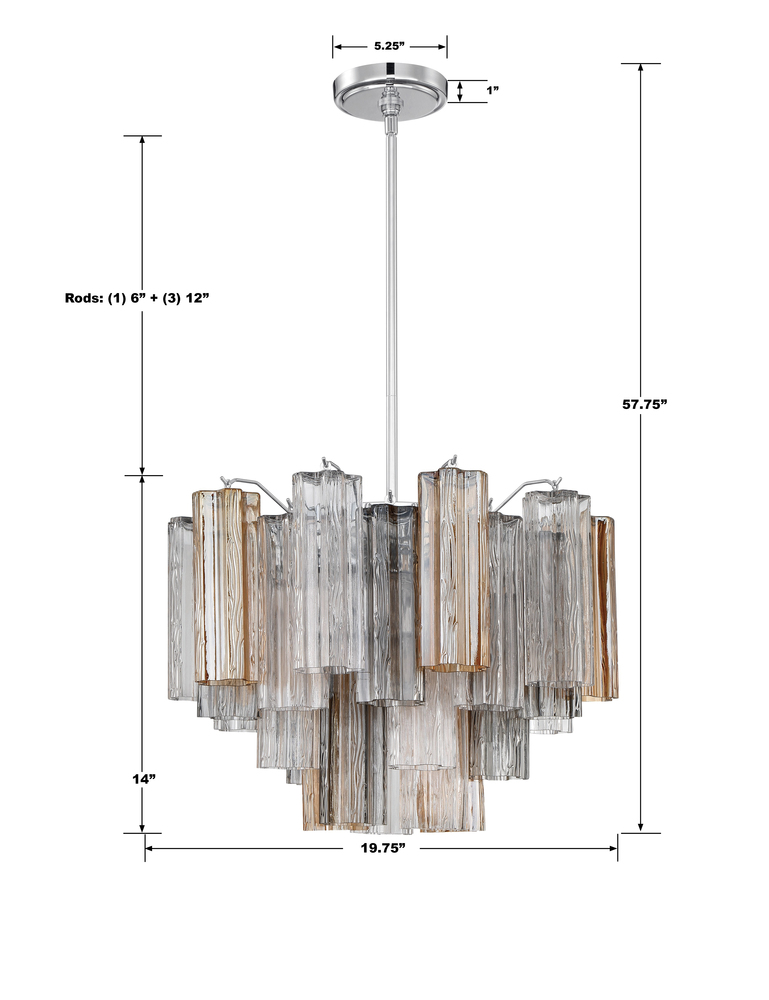 The captivating Addis Lighting Collection is a modern-day interpretation of the iconic mid-century Tronchi chandelier. Inspired by its predecessor's sleek lines and geometric shapes, the Addis features a polished Chrome or Aged Brass metal frame that exudes sophistication and style. Its unique design showcases transparent tiers of textured Tronchi glass tubes, forming a mesmerizing 5-point rounded star shape. Choose from a range of glass colors, including clear, amber, smoke, and white, or the stunning Autumn option, which features a captivating multicolor disposition of amber, clear, and smoke Tronchi glass. The Addis Lighting Collection offers various sizes and finishes, allowing you to find the perfect fit for your space while adding a touch of timeless elegance.