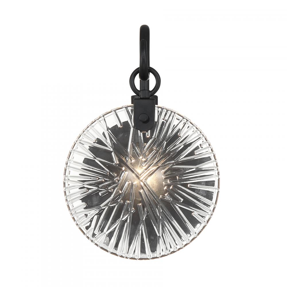 It is often said that lighting is the jewelry of the home. With its fun hook-style arm that holds a flat, round, starburst clear glass shade, the Savoy House Addison 1-light sconce is a great example of this saying. The backplate is finished in Matte Black and mimics the shape of the glass shade. Addison is 9" in height, 5.75" in width and extends 5.5" from the wall. Uses one candelabra size bulb of up to 60 watts. The bulb is not included. This sconce is damp area rated.