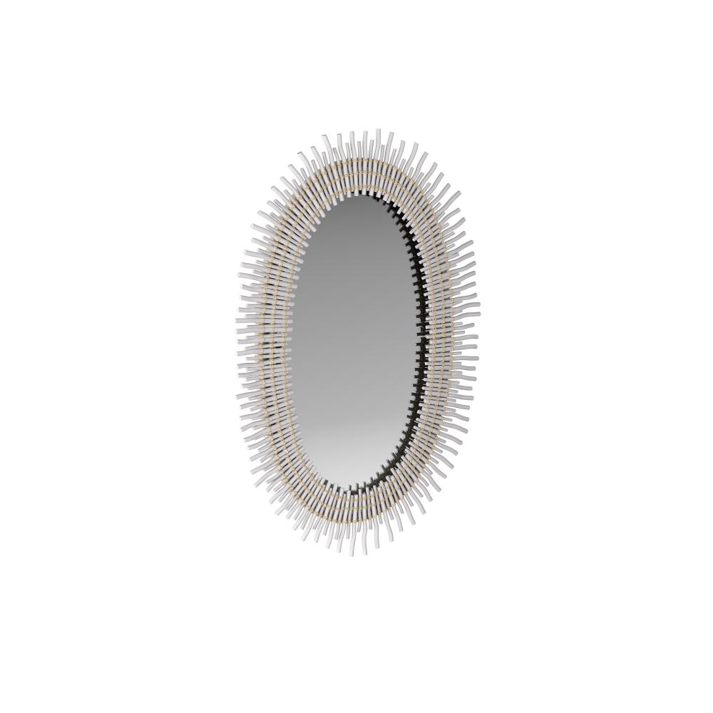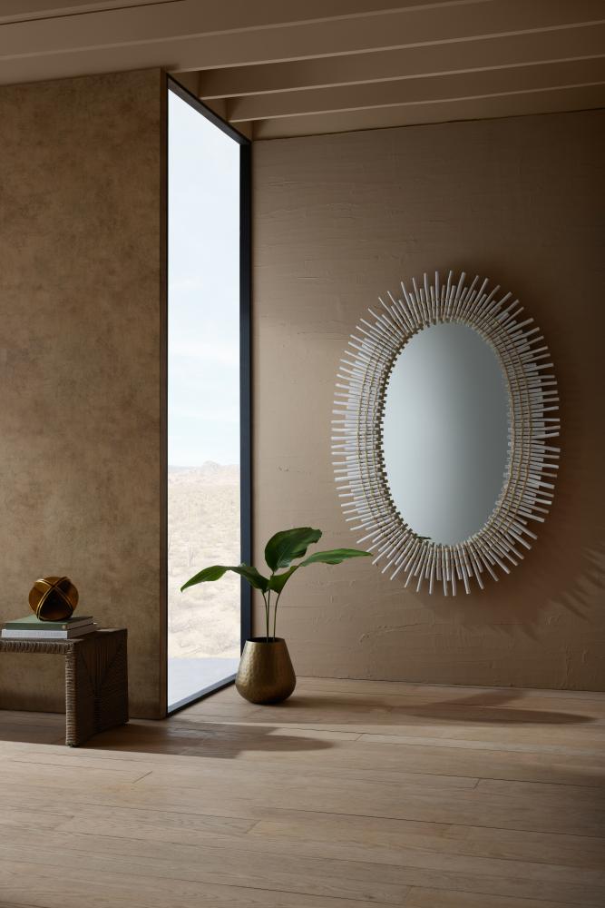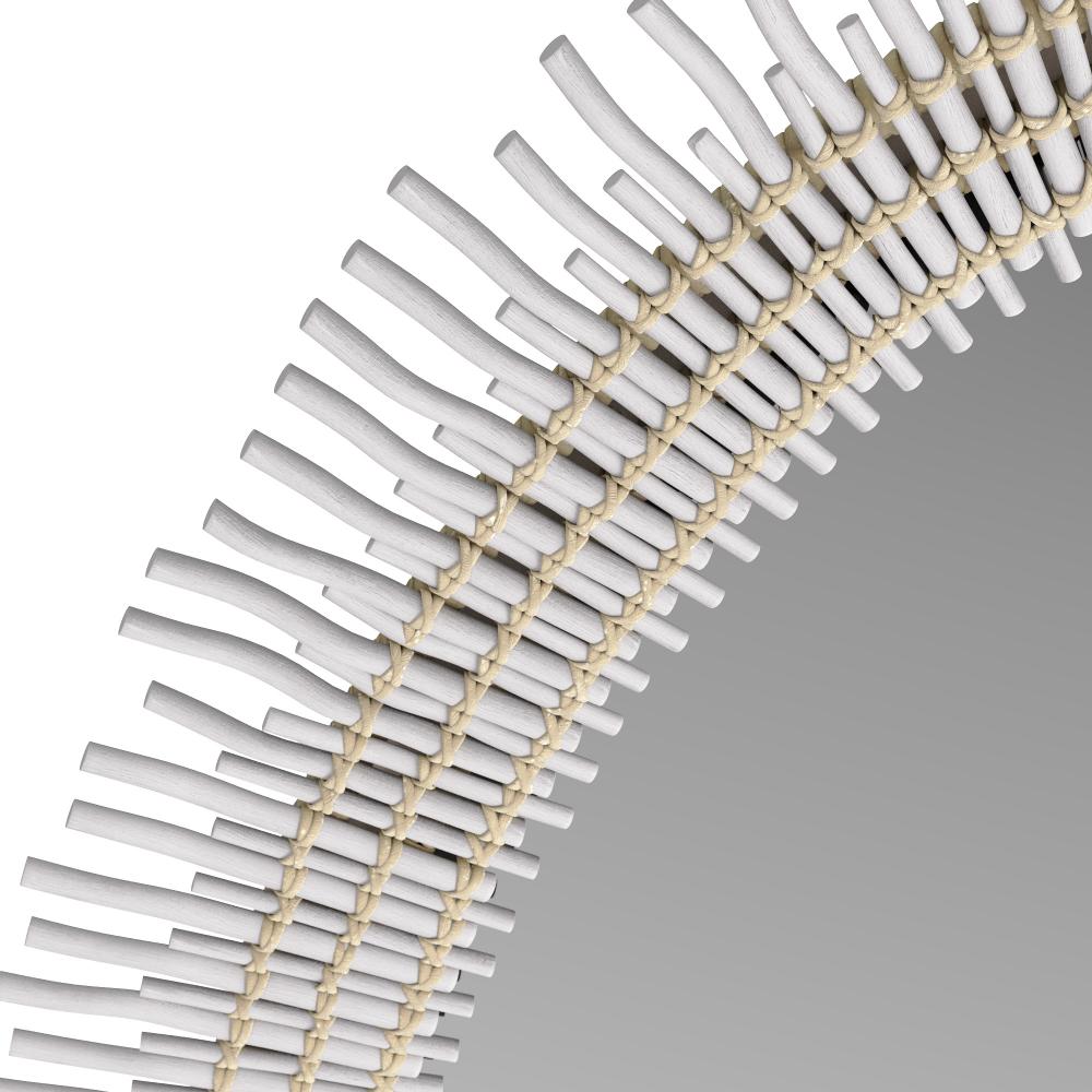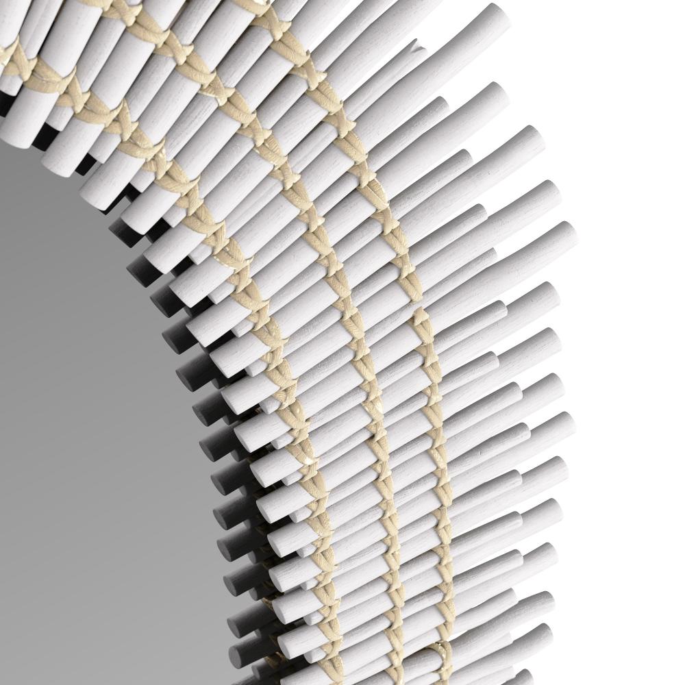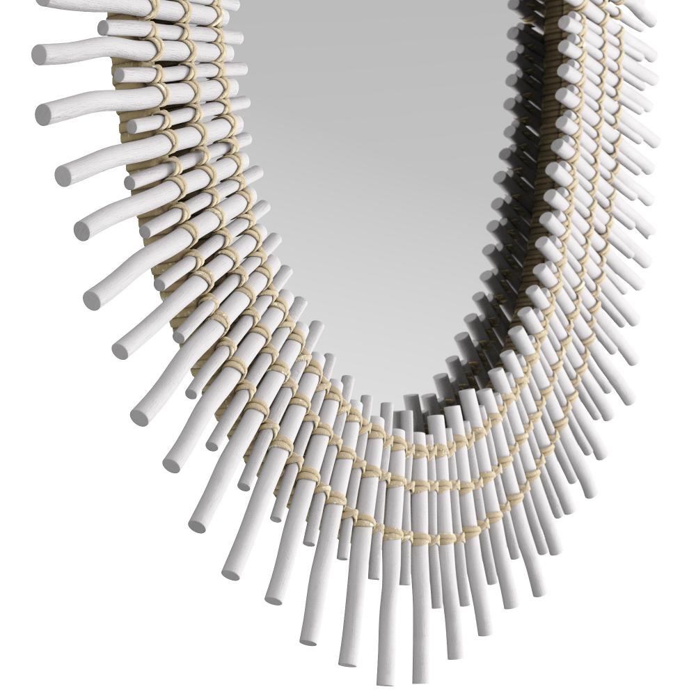 A flourish of natural wood dowels in white-stained wood brings the drama to this oversized oval mirror. A starburst shape is complemented with natural rattan ties and a woven base that add an earthy, elemental look to any room. Both rustic and refined, it was crafted to instantly transform your space. Designed to be hung vertically, it is stabilized with a security cleat. Finish will vary.
