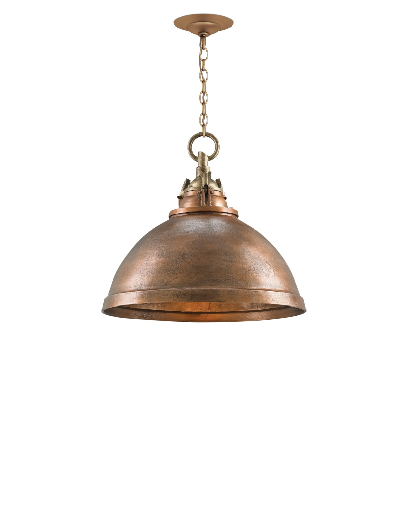 The rich finish on the aluminum body of the Admiral Pendant is a hand-finished copper. It complements the antique brass hardware to bring this versatile dome-shaped pendant a feeling of true warmth. The one-light copper pendant is one of our rough luxe offerings. Adjustable from 25" to 92" with use of included chain/rod kit/cable. If your space calls for a longer drop, additional chain/rods/cable is available for purchase.