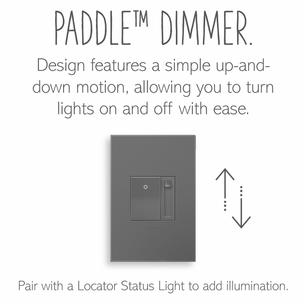 Perfect for anywhere you'd like the combined power of on/off and dimmable lighting control. Turn lights on or off with a simple rocking motion, or slide to dim to your preferred light level. Use this dimmer switch on its own to control a 0-10V light or fixture from a single location, or pair with a 3-way switch to control a single light source from two locations.This dimmer* features enduring Microban? antimicrobial technology that works to reduce the growth of bacteria, around the clock, for the lifespan of the product.* Existing inventory of switches, dimmers and plastic wall plates from the adorne? Collection at some partner locations may not yet include Microban? protection. To confirm that a specific Legrand product is protected with Microban?, check that the exterior of the product packaging includes a green dot or a ""Protected with Microban"" label.Made exclusively for use with screwless Wall Plates from the adorne? Collection, sold separately.No antimicrobial efficacy claims are being made or are valid with respect to products sold in Canada.