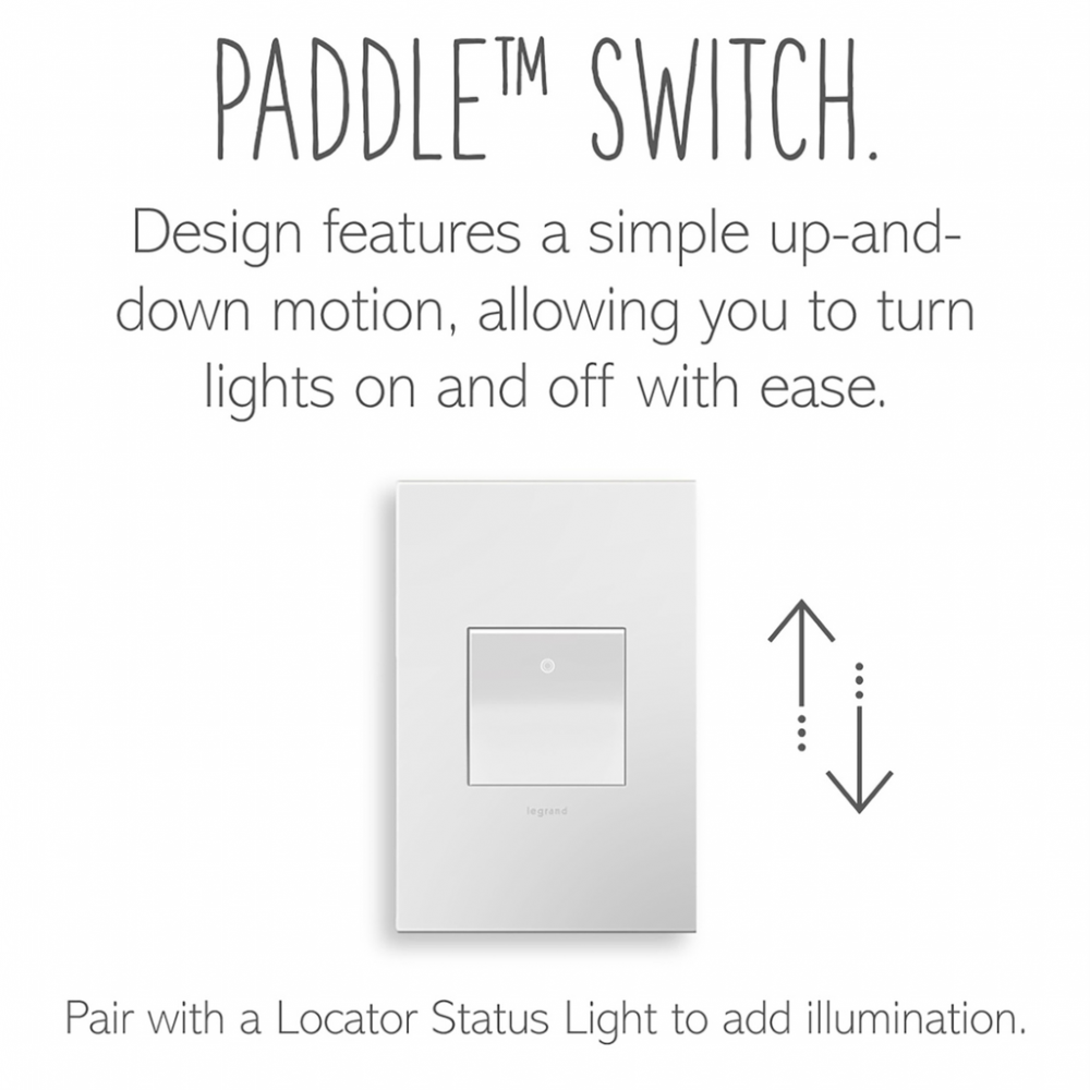 With its twist on classic up-and-down switch control, this modern light switch lets you turn lights on and off with ease. Use the 15A paddle switch on its own to control a light or fixture from a single location, or pair with a second switch to control a single light source from two locations (3-way control).This switch* features enduring Microban? antimicrobial technology that works to reduce the growth of bacteria, around the clock, for the lifespan of the product.* Existing inventory of switches, dimmers and plastic wall plates from the adorne? Collection at some partner locations may not yet include Microban? protection. To confirm that a specific Legrand product is protected with Microban?, check that the exterior of the product packaging includes a green dot or a ""Protected with Microban"" label.Made exclusively for use with screwless Wall Plates from the adorne? Collection, sold separately.No antimicrobial efficacy claims are being made or are valid with respect to products sold in Canada.