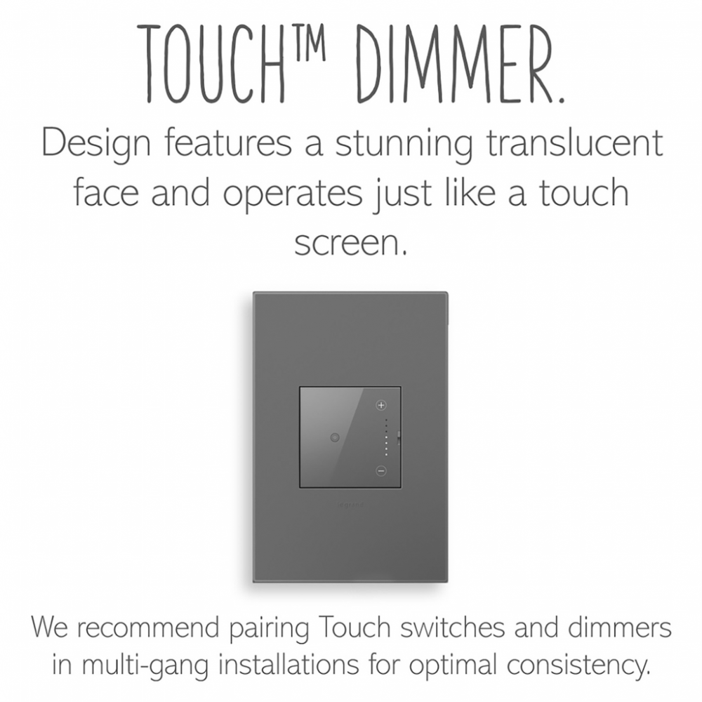 This dimmer switch from the adorne Collection features a translucent, glass-like face and operates with the simple touch of a finger on the center circle to turn lights on/off, or by using the + or - on the side to dim. In multi-gang installations, we recommend using the Touch-control modern light switches and dimmers together for consistency of control and aesthetic. A Tru-Universal Dimmer, this device self-calibrates to work with virtually any 120V dimmable bulb or fixture (excludes 0-10V).This dimmer* features enduring Microban? antimicrobial technology that works to reduce the growth of bacteria, around the clock, for the lifespan of the product.* Existing inventory of switches, dimmers and plastic wall plates from the adorne? Collection at some partner locations may not yet include Microban? protection. To confirm that a specific Legrand product is protected with Microban?, check that the exterior of the product packaging includes a green dot or a ""Protected with Microban"" label.Made exclusively for use with screwless Wall Plates from the adorne? Collection, sold separately.No antimicrobial efficacy claims are being made or are valid with respect to products sold in Canada.