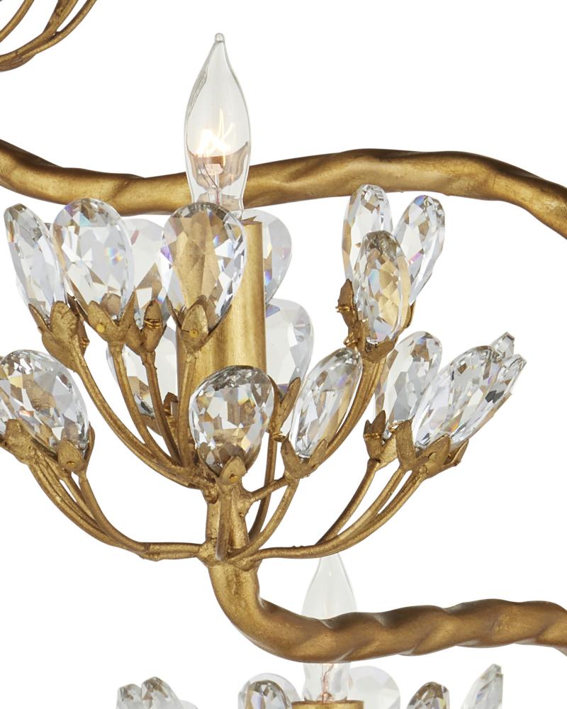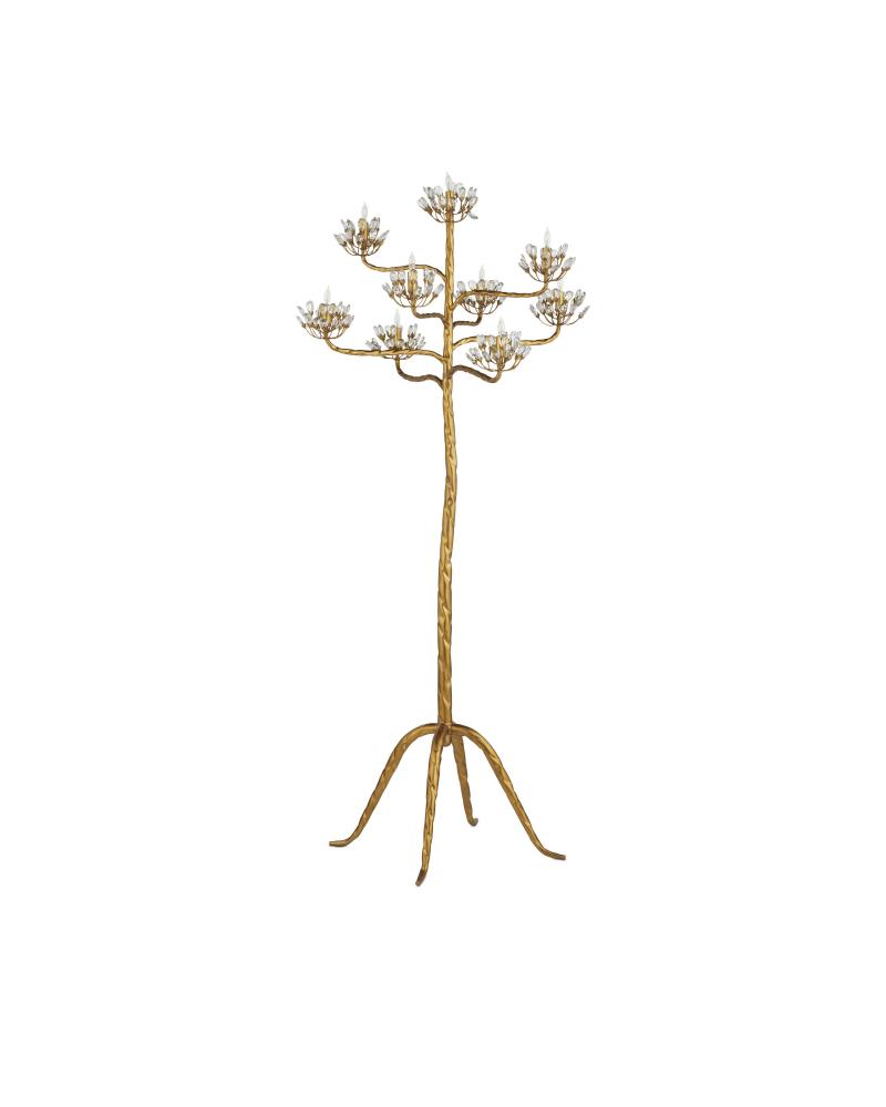 The Agave Americana Floor Candelabra is a grand piece inspired by the Century plant of the American desert. Nine lights are surrounded by clusters of faceted crystals fitted to branches of hand-forged metal tubes in a contemporary gold leaf finish. The gold floor lamp is in our Marjorie Skouras Collection.