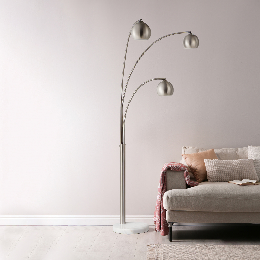The Aguillard floor lamp is ready to triple the lighting impact in any home or office. Its iconic trio of dome shades hold a structural presence in any room, making a statement of timeless style through brushed nickel-plated iron and white marble. Turn it on with its convenient foot switch to bring light and modern style to your decorating scheme.