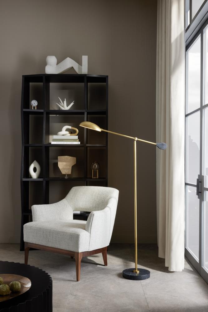 A contemporary take on the traditional floor lamp, the Alaric pairs pivoting arms of antique brass with contrast accents of black resin. Lacquered with an interior of purest white, the bud-shaped shade allows for perfect illumination. Designed with a round base of black marble to anchor it securely to the floor. The taupe cloth cord features an on/off switch.