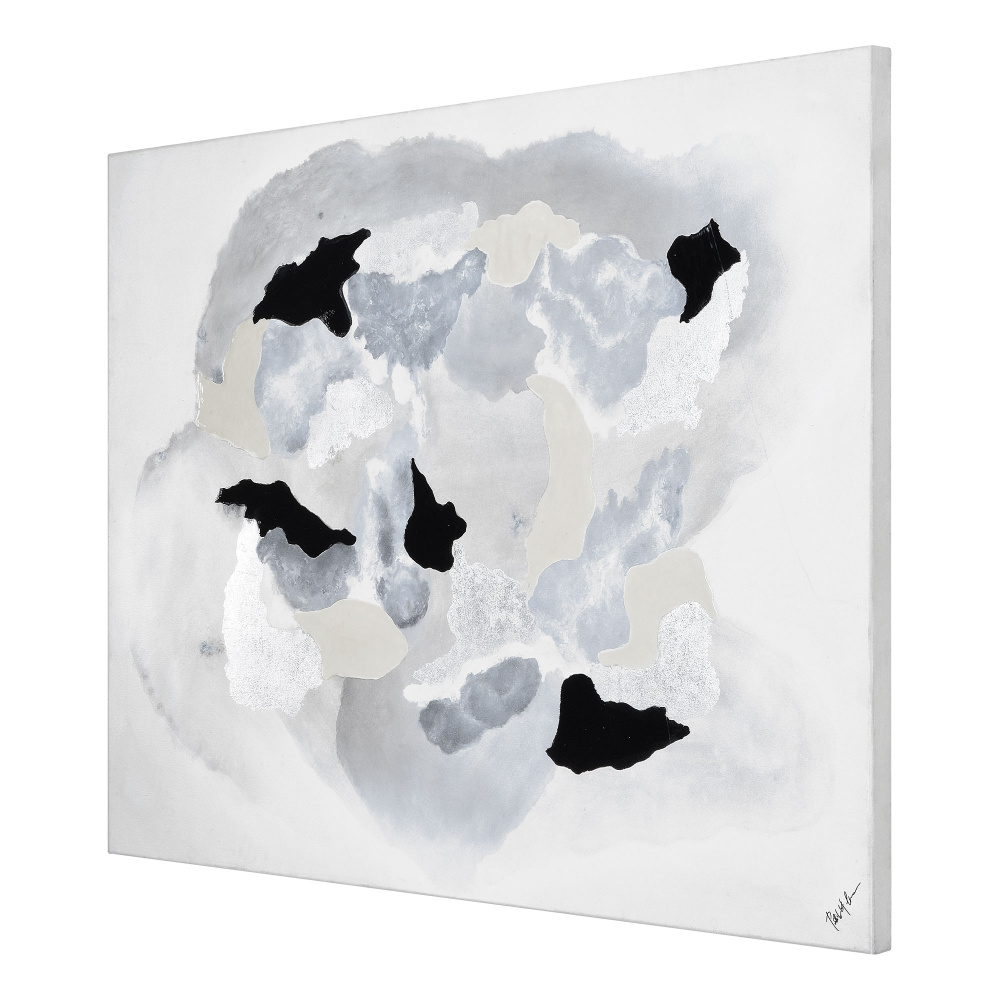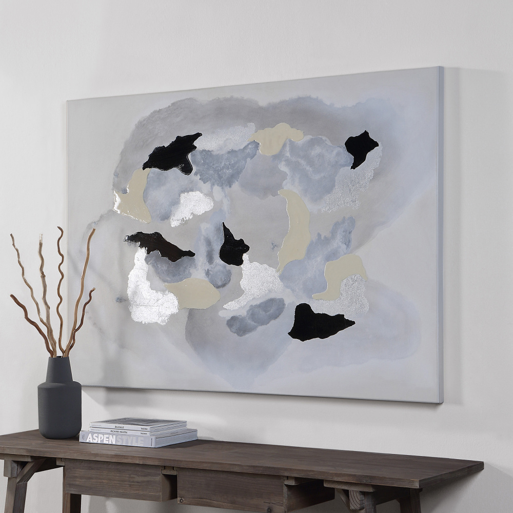 Clients dreaming of creating an ethereal yet modern space in their home or business will find all their needs met in this piece of canvas art. Hanging horizontally or vertically, its abstract shapes and contrasting palette take on a new life at each angle. Best styled with dark, minimalist furnishings and decor, the dark brush strokes on the art painting allow for the living room or bedroom it's set within to feel cohesive.
