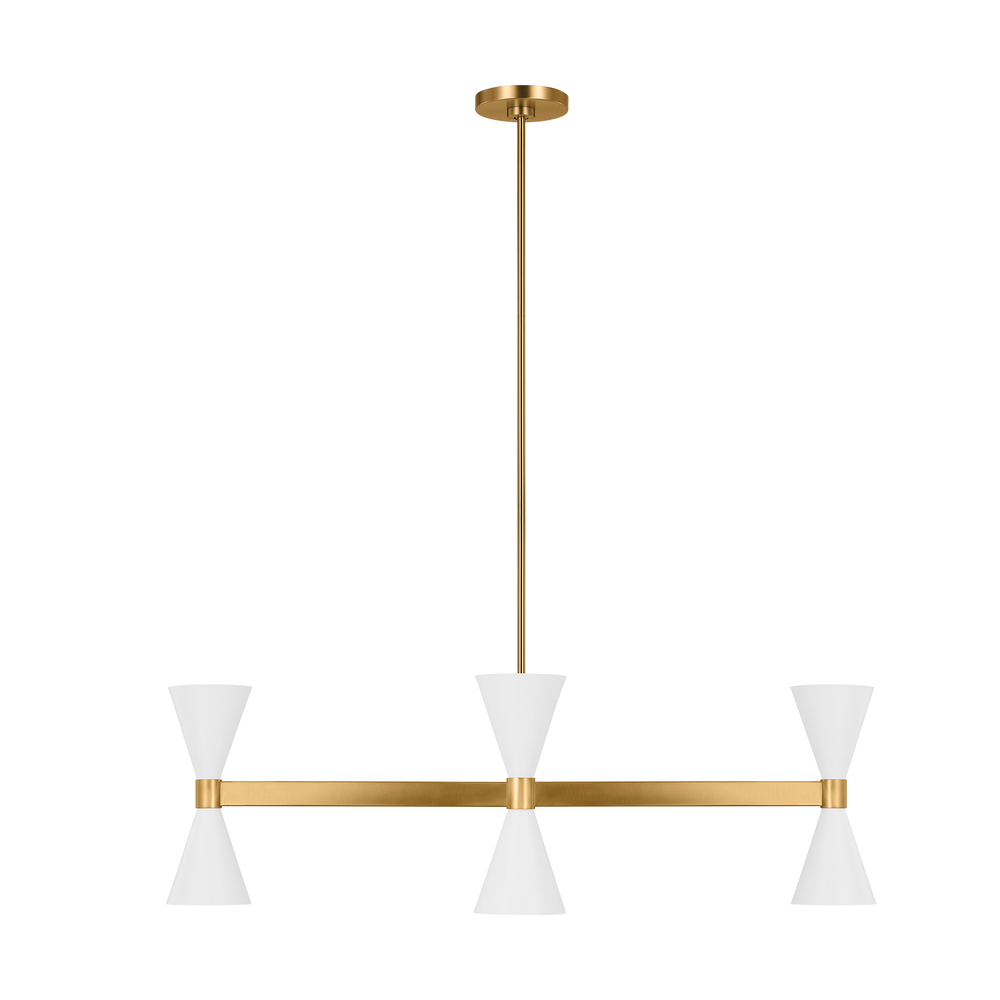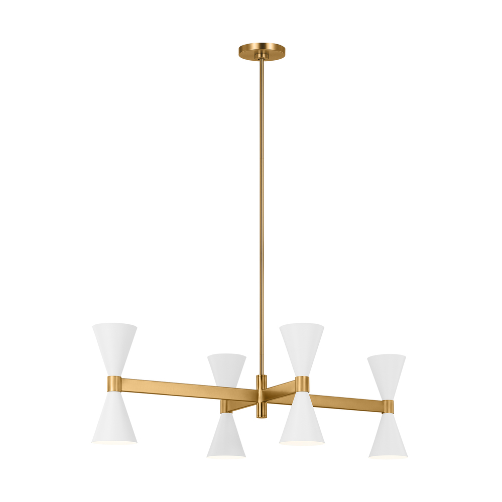 The Albertine chandelier by AERIN for Visual Comfort Studio Collection emits ample light above and below from eight conical lights on a crossed frame. This sophisticated piece provides a strong focal point in a large room and is a versatile style that works in both traditional and contemporary interiors. Ideal for a living room or above a dining table.