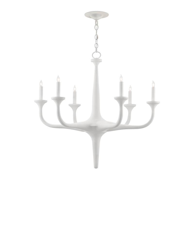 The Albion Chandelier is one of our creations that shows off our skill with finishes, the wrought iron fixture so smoothly covered in gesso white that it reads like it has been sculpted from a pliable material. The six-light chandelier is seriously flexible in the number of stylistic notes it can manage, its snowy countenance perfect for rooms as diverse as Hollywood glamour to cleanly contemporary.