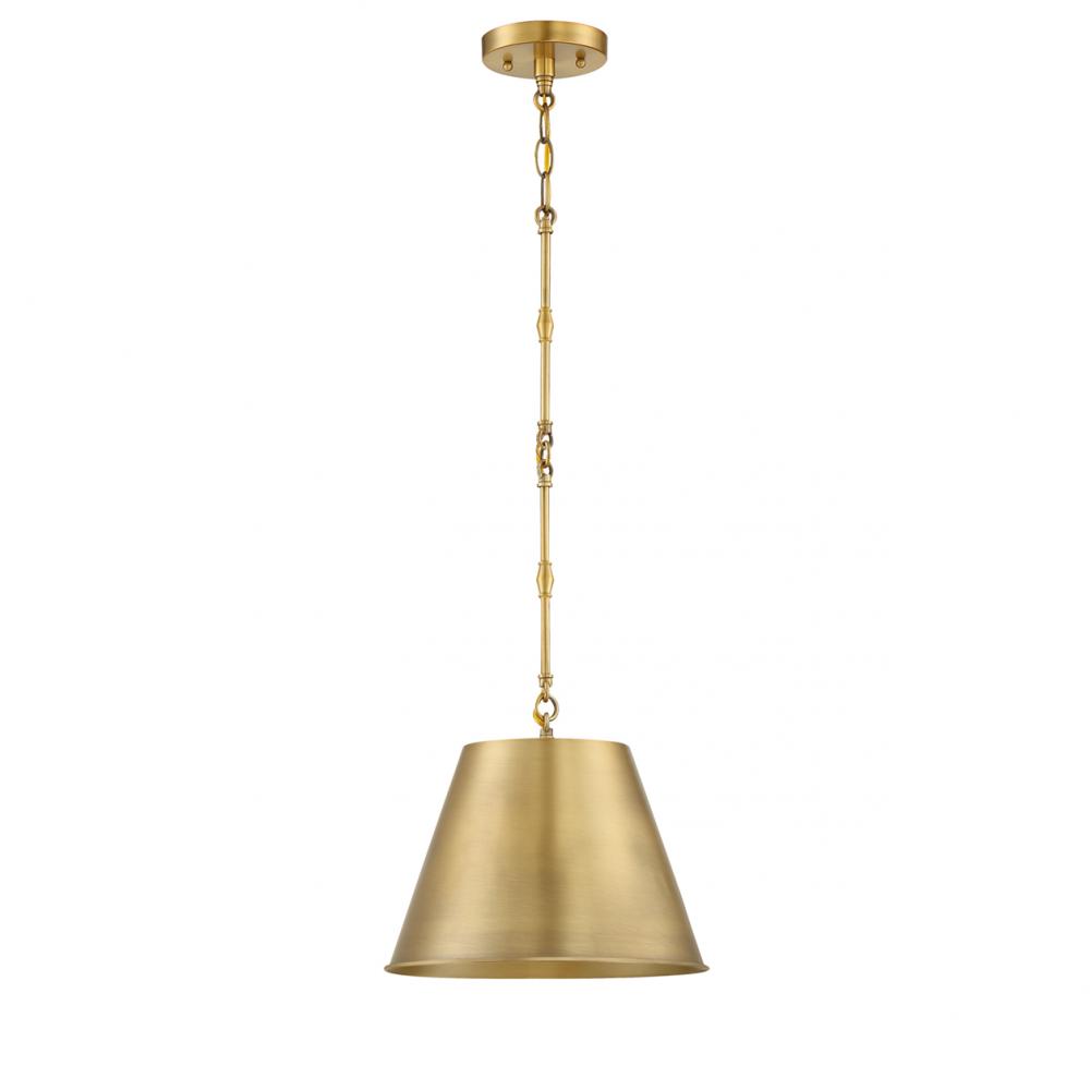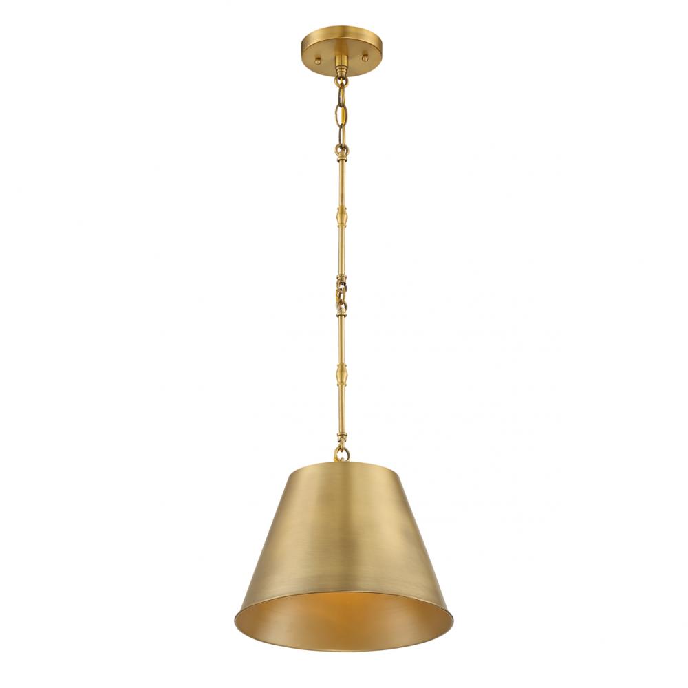 The Savoy House Alden 1-light pendant showcases the beauty of metals with an opaque shade and subtle, smart detailing on the hanging chain, creating an eye-catching look for your home. Warm brass finish. Pendants are extremely versatile and can fit in many different spaces, such as kitchens, family rooms, great rooms, foyers, entryways, offices, bedrooms and bathrooms. Because this pendant is chain-hung, you can use as much or as little chain as you need to fit your specific hanging height needs, and this pendant can be used on a sloped ceiling. Alden’s shade design concentrates light downward, so it is great for directed task lighting. You can pair Alden with hardware finished in brass or mix it with hardware in other finishes. Its relaxed elegance means it is a perfect choice for rooms of any decor style. When you choose a Savoy House lighting fixture, you can be certain you've selected a piece that will withstand the test of time.