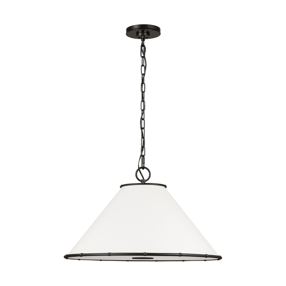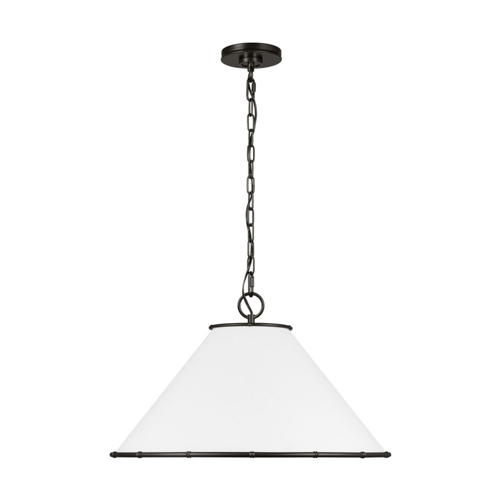 Crafted with Steel in a Aged Iron finish with silk screen white inside clear outside glass diffuser and white linen fabric shade