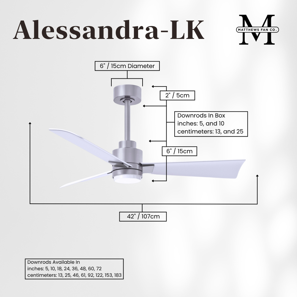 Minimal form with maximum efficiency. With a wide range of sizes, the Alessandra can accommadate any size space. This thoughtfully crafted and versatile fan will complement any aesthetic and improves the health and comfort of any room. Highly customizable, the Alessandra is available in 5 different body finishes, 6 blade options and even a color changeable light kit. Suitable for fully exposed outdoor areas. Backed by a limited lifetime warranty, our fans are of the highest quality and will dutifully perform for years to come.