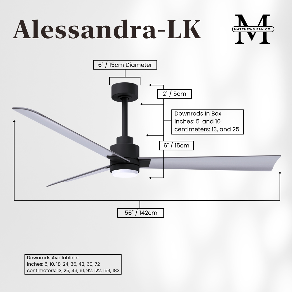 Minimal form with maximum efficiency. With a wide range of sizes, the Alessandra can accommadate any size space. This thoughtfully crafted and versatile fan will complement any aesthetic and improves the health and comfort of any room. Highly customizable, the Alessandra is available in 5 different body finishes, 6 blade options and even a color changeable light kit. Suitable for fully exposed outdoor areas. Backed by a limited lifetime warranty, our fans are of the highest quality and will dutifully perform for years to come.