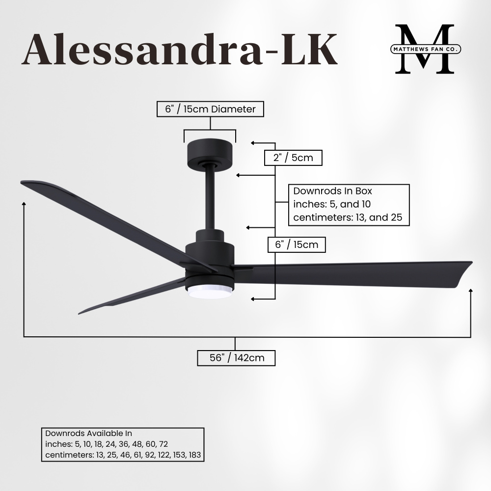 Minimal form with maximum efficiency. With a wide range of sizes, the Alessandra can accommadate any size space. This thoughtfully crafted and versatile fan will complement any aesthetic and improves the health and comfort of any room. Highly customizable, the Alessandra is available in 5 different body finishes, 6 blade options and even a color changeable light kit. Suitable for fully exposed outdoor areas. Backed by a limited lifetime warranty, our fans are of the highest quality and will dutifully perform for years to come.