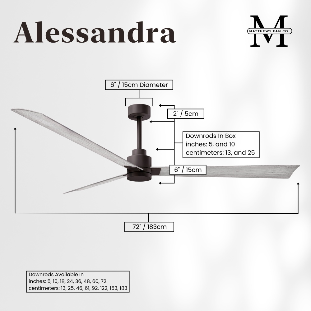 Minimal form with maximum efficiency. With a wide range of sizes, the Alessandra can accommadate any size space. This thoughtfully crafted and versatile fan will complement any aesthetic and improves the health and comfort of any room. Highly customizable, the Alessandra is available in 5 different body finishes, 6 blade options and even a color changeable light kit. Suitable for fully exposed outdoor areas. Backed by a limited lifetime warranty, our fans are of the highest quality and will dutifully perform for years to come.