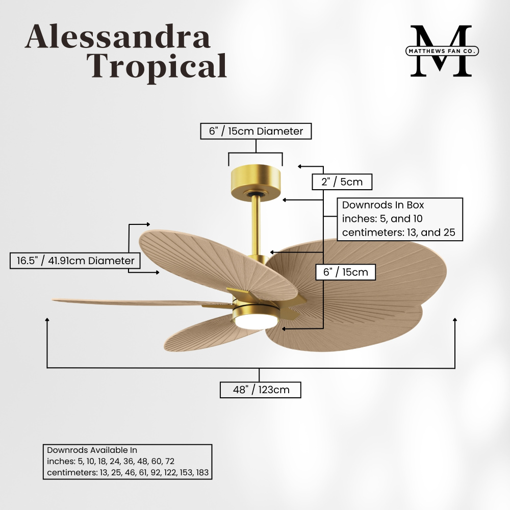 Minimal tropical form with maximum efficiency in 48". The thoughtfully crafted and versatile wet location Alessandra Tropical will complement any aesthetic and improve the health and comfort of any room. Highly customizable, the Alessandra Tropical is available in 5 different body finishes, 10 blade finish options and color changing light kit. Backed by a limited lifetime warranty, our fans are of the highest quality and will dutifully perform for years to come.