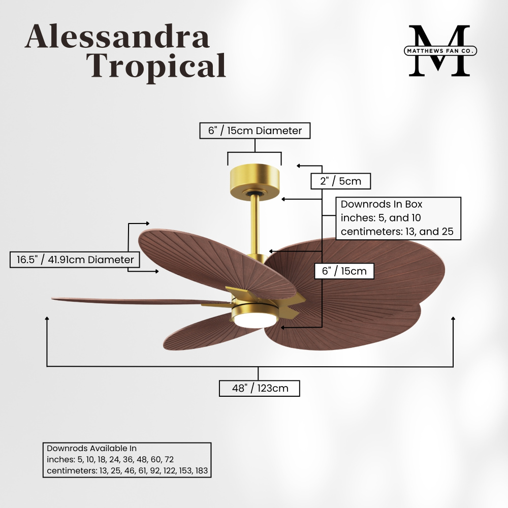 Minimal tropical form with maximum efficiency in 48". The thoughtfully crafted and versatile wet location Alessandra Tropical will complement any aesthetic and improve the health and comfort of any room. Highly customizable, the Alessandra Tropical is available in 5 different body finishes, 10 blade finish options and color changing light kit. Backed by a limited lifetime warranty, our fans are of the highest quality and will dutifully perform for years to come.