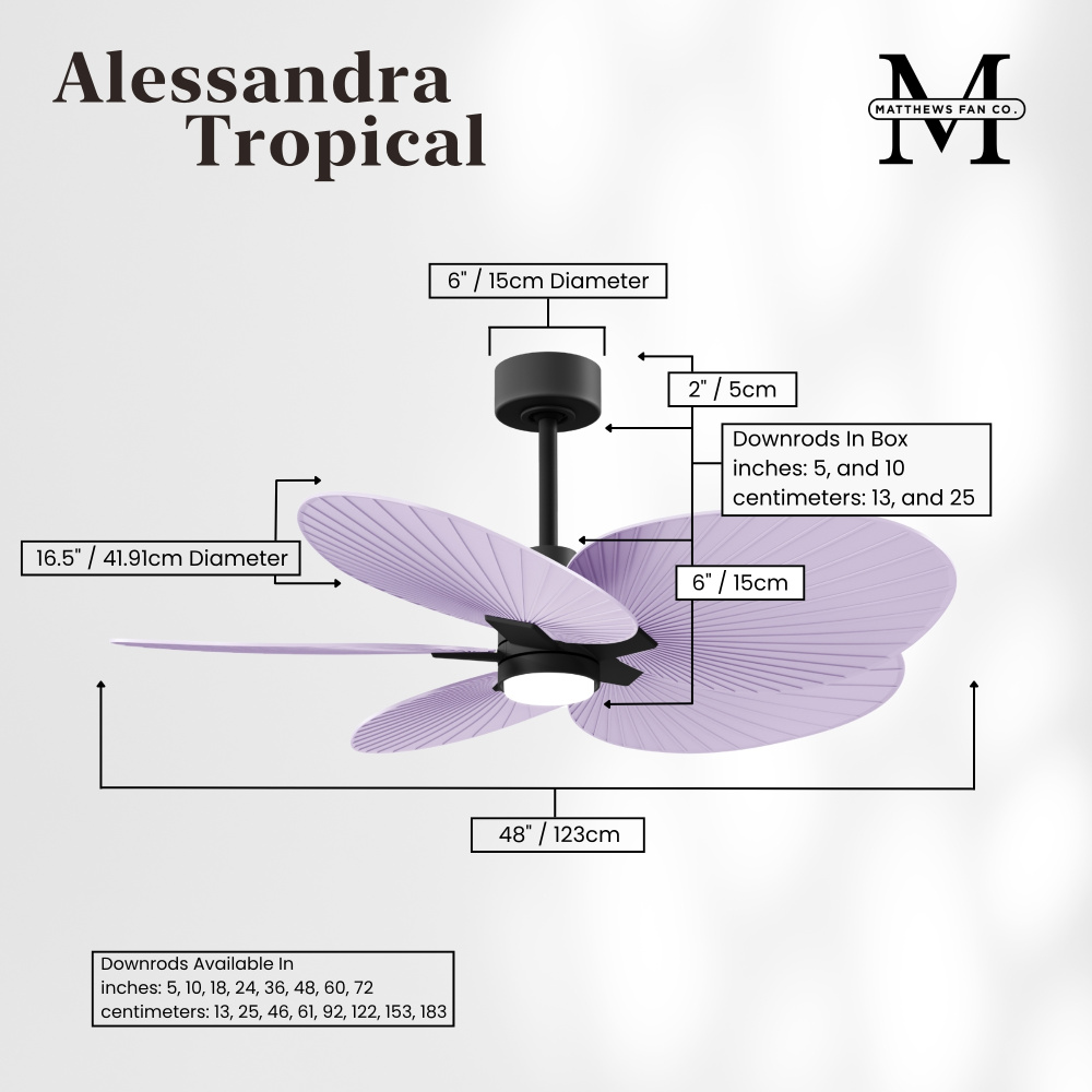 Minimal tropical form with maximum efficiency in 48". The thoughtfully crafted and versatile wet location Alessandra Tropical will complement any aesthetic and improve the health and comfort of any room. Highly customizable, the Alessandra Tropical is available in 5 different body finishes, 10 blade finish options and color changing light kit. Backed by a limited lifetime warranty, our fans are of the highest quality and will dutifully perform for years to come.