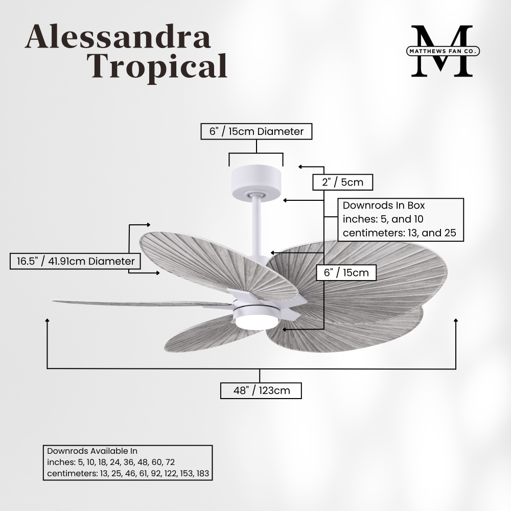 Minimal tropical form with maximum efficiency in 48". The thoughtfully crafted and versatile wet location Alessandra Tropical will complement any aesthetic and improve the health and comfort of any room. Highly customizable, the Alessandra Tropical is available in 5 different body finishes, 10 blade finish options and color changing light kit. Backed by a limited lifetime warranty, our fans are of the highest quality and will dutifully perform for years to come.