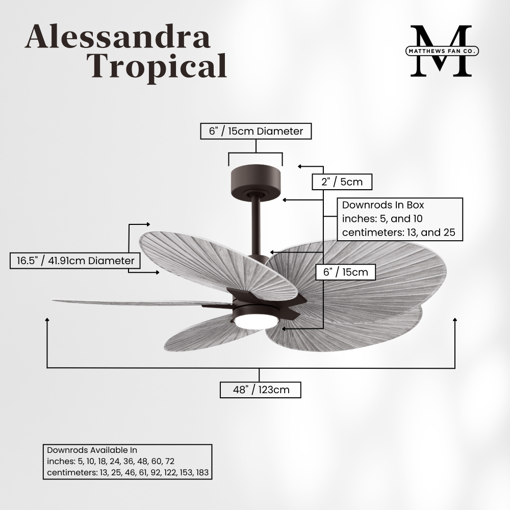 Minimal tropical form with maximum efficiency in 48". The thoughtfully crafted and versatile wet location Alessandra Tropical will complement any aesthetic and improve the health and comfort of any room. Highly customizable, the Alessandra Tropical is available in 5 different body finishes, 10 blade finish options and color changing light kit. Backed by a limited lifetime warranty, our fans are of the highest quality and will dutifully perform for years to come.
