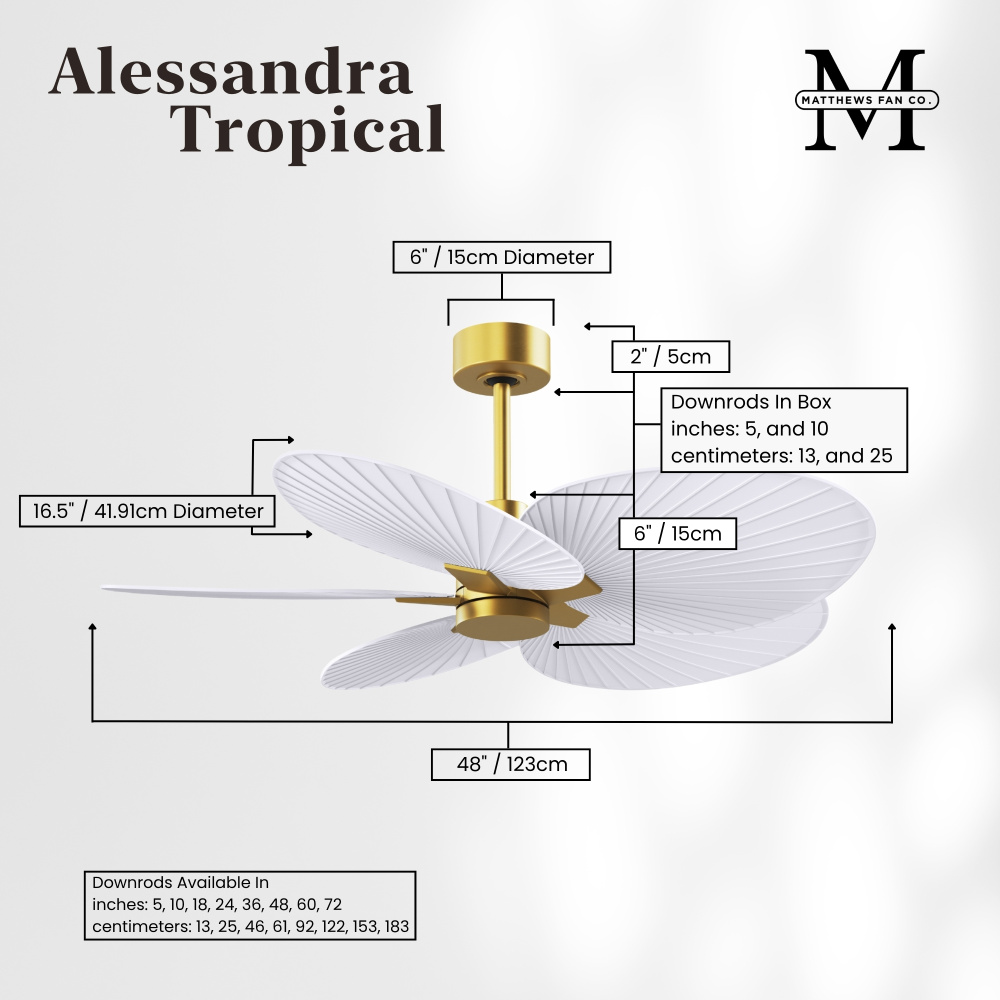 Minimal tropical form with maximum efficiency in 48". The thoughtfully crafted and versatile wet location Alessandra Tropical will complement any aesthetic and improve the health and comfort of any room. Highly customizable, the Alessandra Tropical is available in 5 different body finishes, 10 blade finish options and color changing light kit. Backed by a limited lifetime warranty, our fans are of the highest quality and will dutifully perform for years to come.