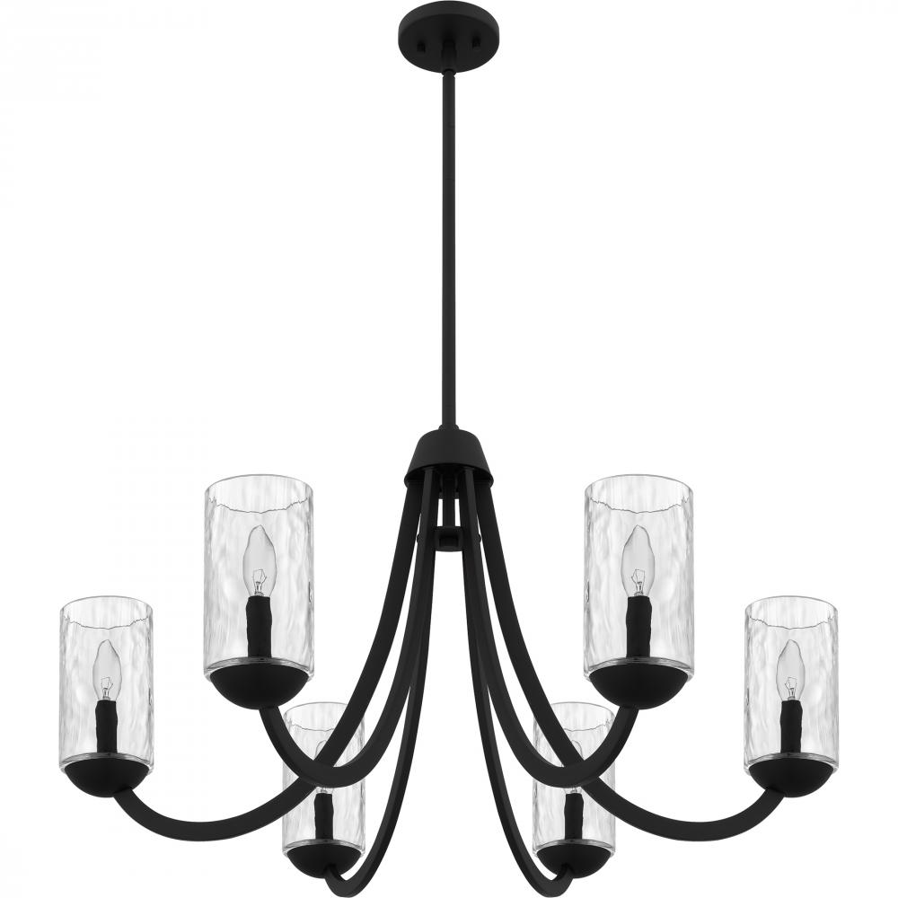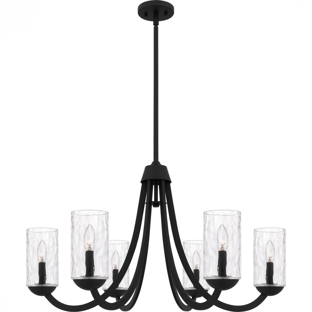 The Allard chandelier is a stunning centerpiece that commands attention. Clear water glass shades add a touch of sophistication and allow the light to shine through brilliantly. Choose from two sizes of chandelier in either matte black or brushed nickel to