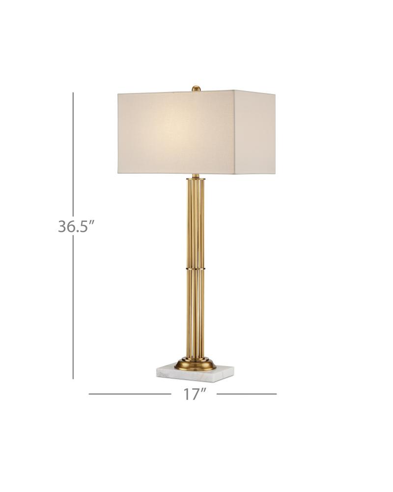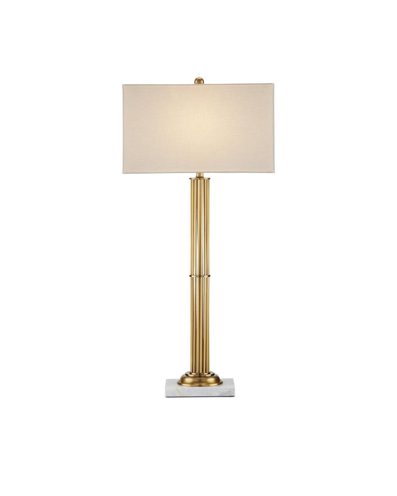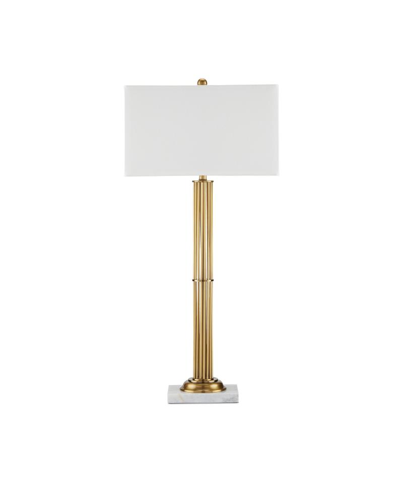 The design story the Allegory Table Lamp tells is a sleek and gleaming one. The extra tall and slender cylindrical body of the gold lamp is formed from rods made of metal in an antique brass finish that are cleverly clasped together by a thin central ring. The white marble base and rectangular shade are pale elements that contrast the warmth of the metal, including the matching antique brass finial.