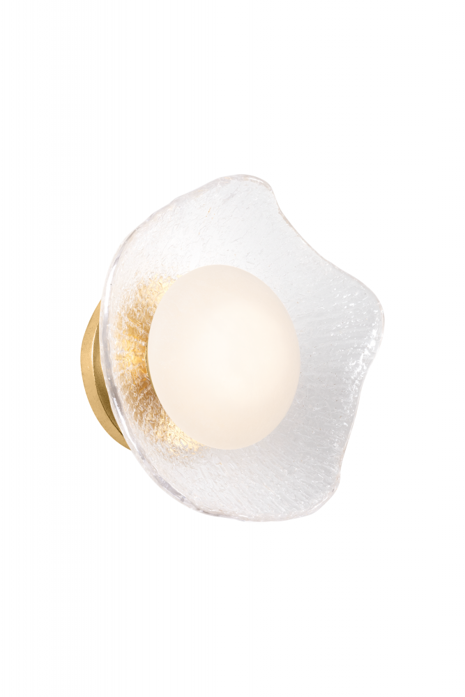 Combining organic and modern elements, Almandine is an elevated take on a traditional ring chandelier. The minimalist frame is accented with floral-shaped shades hand-cut from fluted piastre glass. Finished in Vintage Gold Leaf, the restrained metalwork allows the beauty of the blooms to shine. Almandine is available as a single-tier chandelier with 6 or 9 lights, a double-tier chandelier with 15 lights, and a single-light wall sconce.