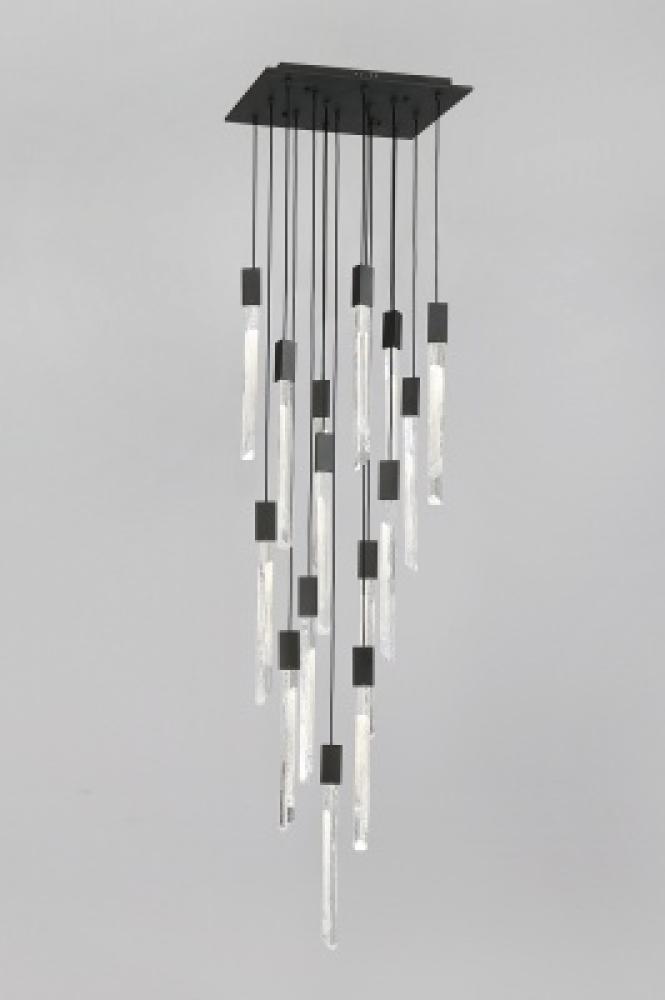 The Alpine collection's signature cascading marbleized crystals artfully evoke rainfall. Fifteen angular crystals suspend from a sleek canopy to cast a dramatic glow.