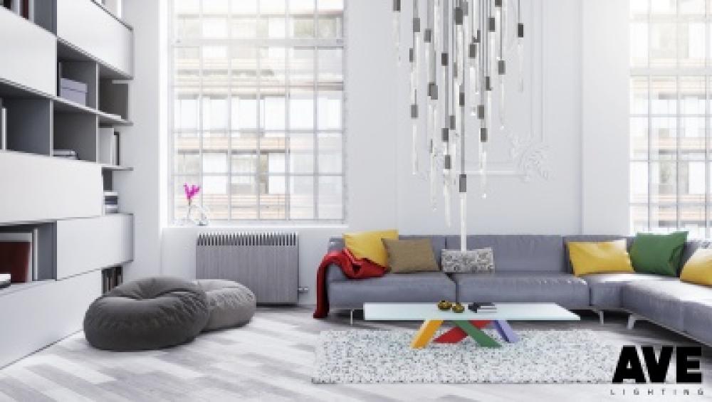 The Alpine collection's signature cascading marbleized crystals artfully evoke rainfall. Thirty-one angular crystals suspend from a sleek canopy to cast a dramatic glow.