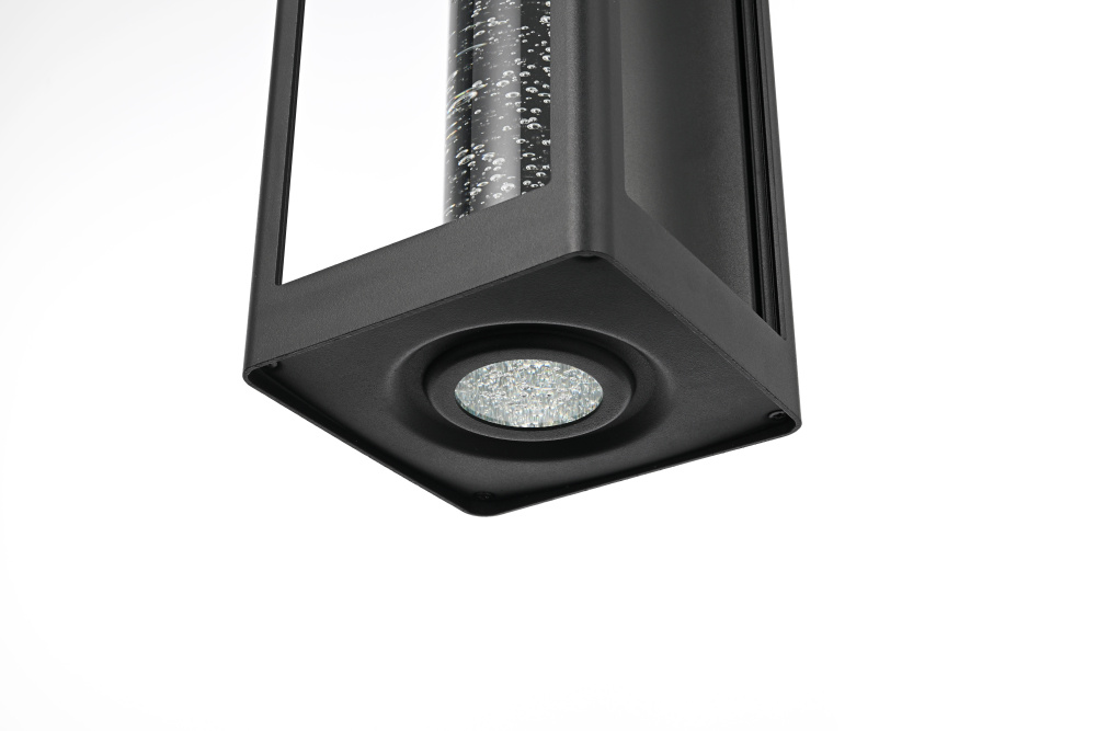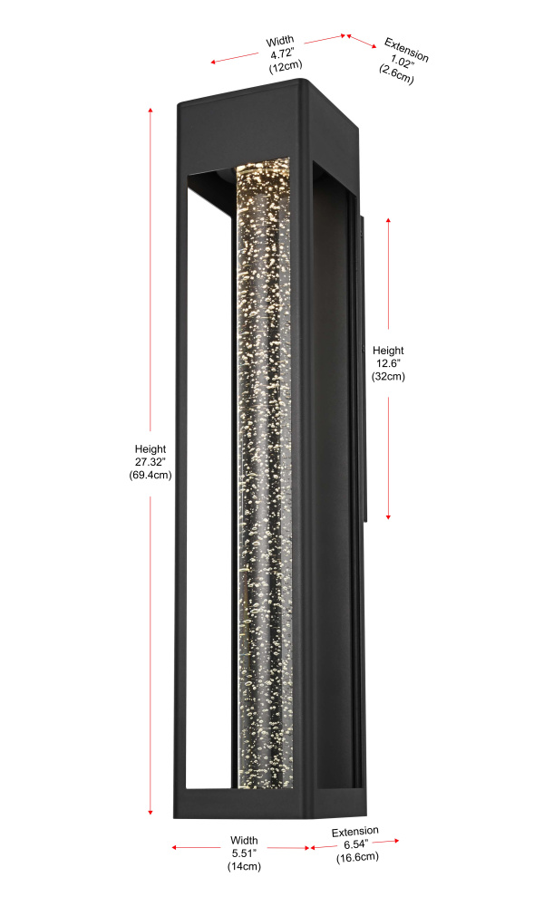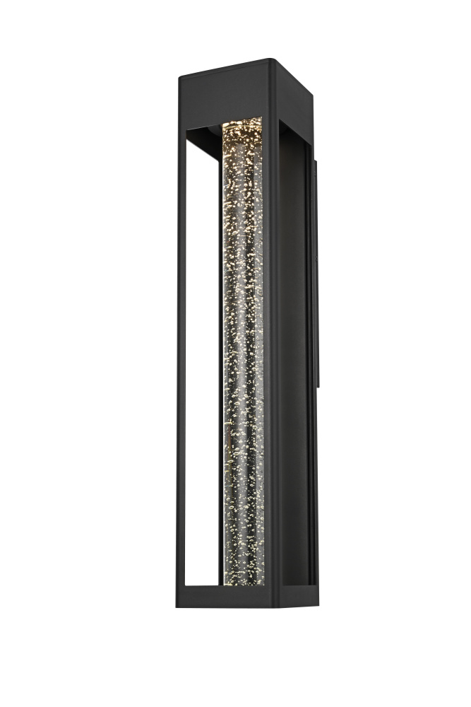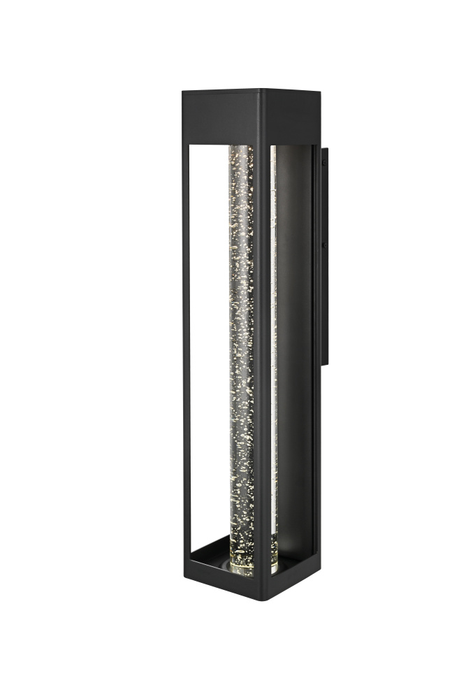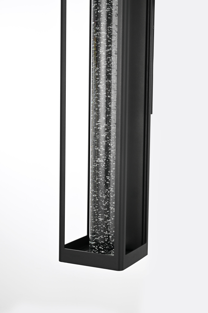 Designed with a strong geometric frame, this LED wall sconce adds structure and definition to outdoor spaces. The rectangular black metal body encloses a thick 2.5-inch clear seedy glass cylinder, which enhances the light diffusion while maintaining a crisp, modern glow. Built for durability, the iron and aluminum frame ensures long-term performance, while the ETL Wet Rated certification makes it a reliable choice for entryways, patios, and exterior walls. The compact 5”L x 1”W x 12.5”H backplate allows for a secure and streamlined mount, and the 7-inch pre-wired lead simplifies installation. Featuring an integrated 11W LED, this fixture emits a warm 3000K light at 350 lumens, with a 120-degree beam angle and 90 CRI for balanced illumination. Dimmable and hardwired for stability, this sconce combines precision and functionality for contemporary exteriors. Available in multiple sizes from 10” to 32”, this fixture provides flexibility for different architectural styles and placements. Built with marine-grade, corrosion-resistant aluminum, this sconce withstands coastal conditions for long-lasting durability.