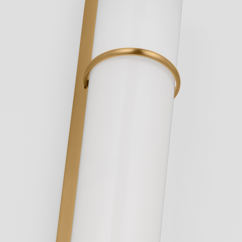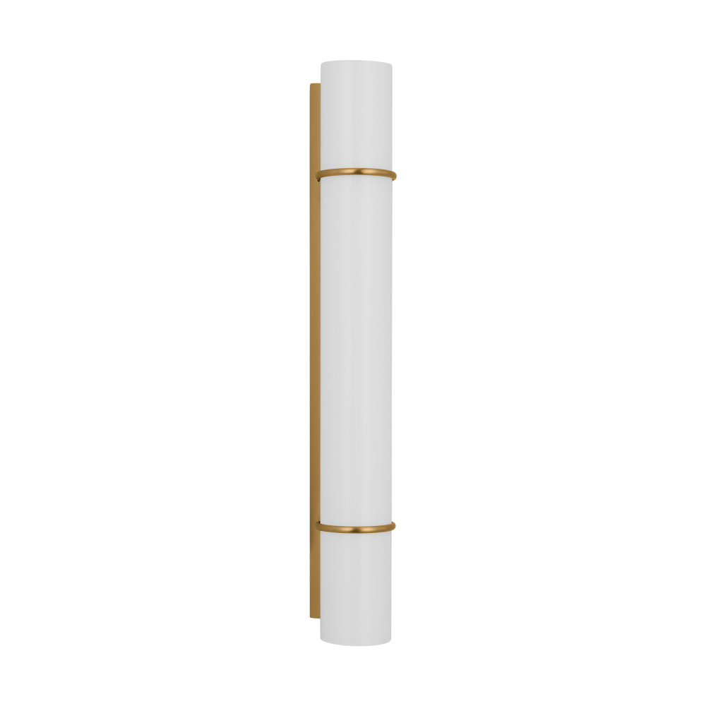 The Amelie Integrated LED vanity series by Chapman & Myers is a simplified cylindrical linear bath light with two metal rings inspired by a vintage cuff bracelet. Each sconce has a cylindrical glass shade accented by two metal rings on either end of the sconce and a metal back plate. Amelie is illuminated with custom-led panels to provide an even glow through the white glass shades. Available in three sizes and three finish options. Dimmable Integrated LED lamping with Damp location rating.