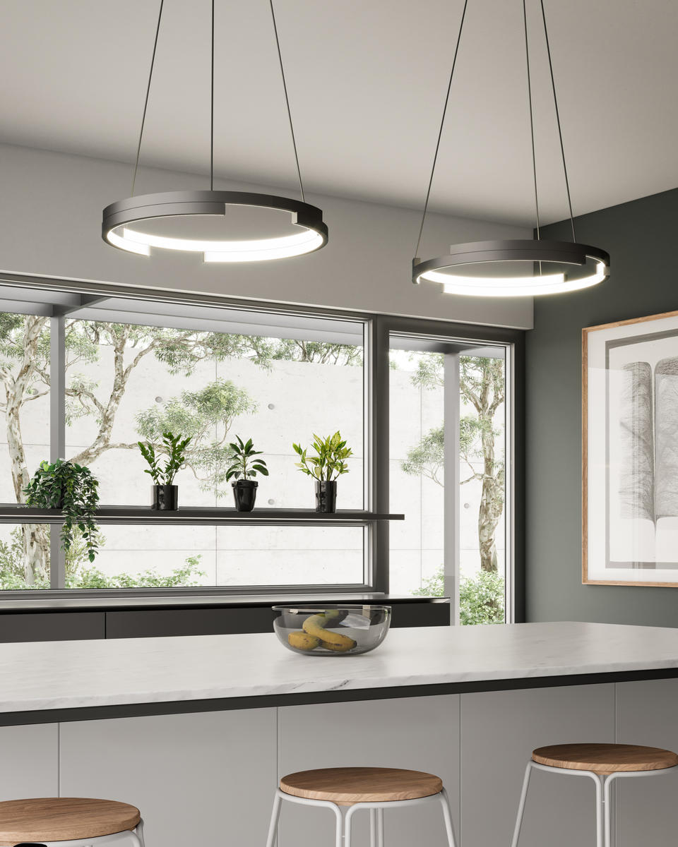 Three layers of gently arched metal bands combine to form an asymmetric architectural appearance. The offset illuminated components create a dynamic lamp that changes visually depending on your viewpoint.